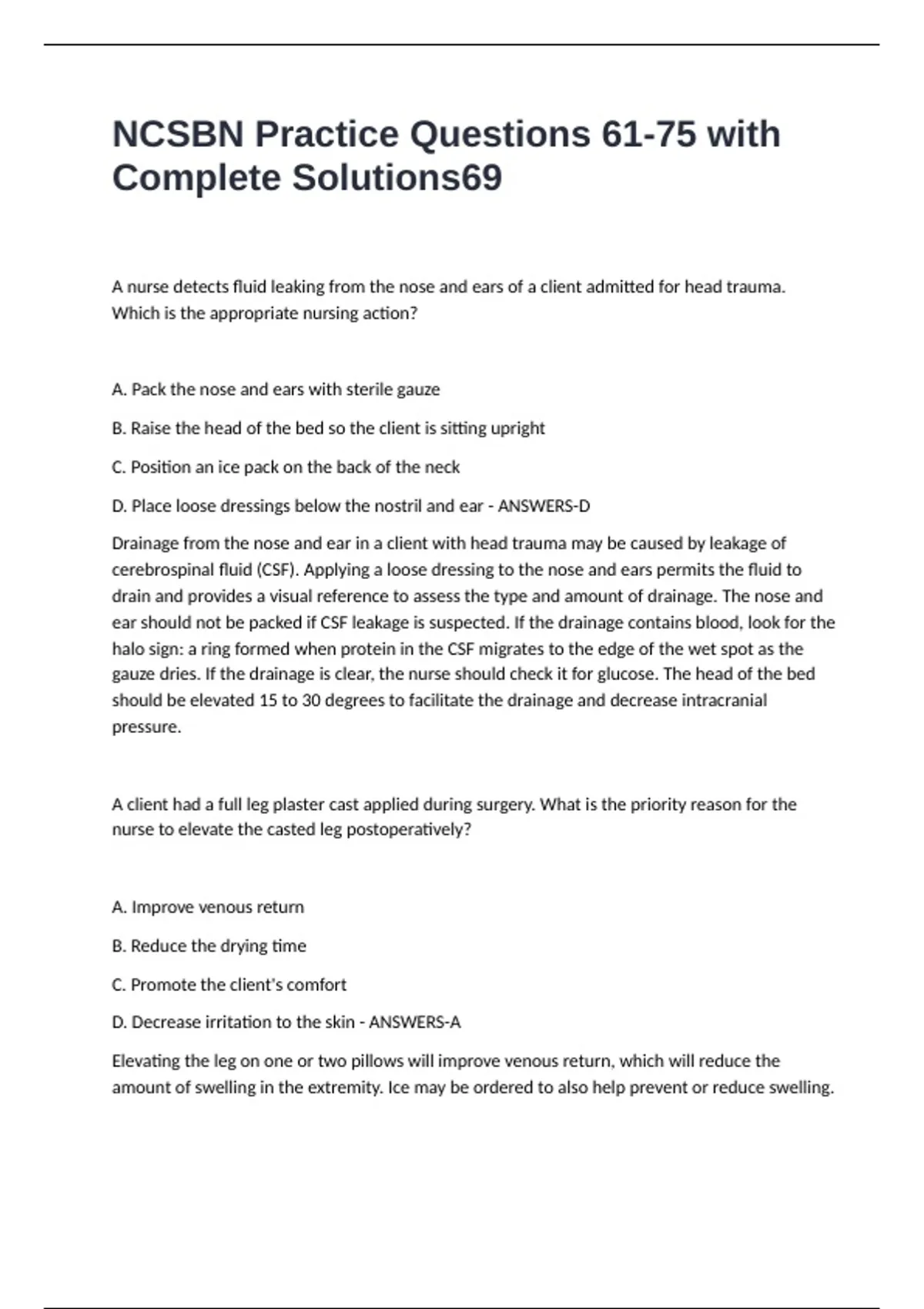 NCSBN Practice Questions 61-75 with Complete Solutions A nurse detects fluid leaking from the nose and ears of a client admitted for head trauma. Which is the appropriate nursing action? A. Pack the nose and ears with sterile gauze B. Raise the head of the bed so the client is sitting upright C. Position an ice pack on the back of the neck D. Place loose dressings below the nostril and ear - ANSWERS-D Drainage from the nose and ear in a client with head trauma may be caused by leakage of cerebrospinal fluid (CSF). Applying a loose dressing to the nose and ears permits the fluid to drain and provides a visual reference to assess the type and amount of drainage. The nose and ear should not be packed if CSF leakage is suspected. If the drainage contains blood, look for the halo sign: a ring formed when protein in the CSF migrates to the edge of the wet spot as the gauze dries. If the drainage is clear, the nurse should check it for glucose. The head of the bed should be elevated 15 to 30 degrees to facilitate the drainage and decrease intracranial pressure. A client had a full leg plaster cast applied during surgery. What is the priority reason for the nurse to elevate the casted leg postoperatively? A. Improve venous return B. Reduce the drying time C. Promote the client's comfort D. Decrease irritation to the skin - ANSWERS-A Elevating the leg on one or two pillows will improve venous return, which will reduce the amount of swelling in the extremity. Ice may be ordered to also help prevent or reduce swelling.
