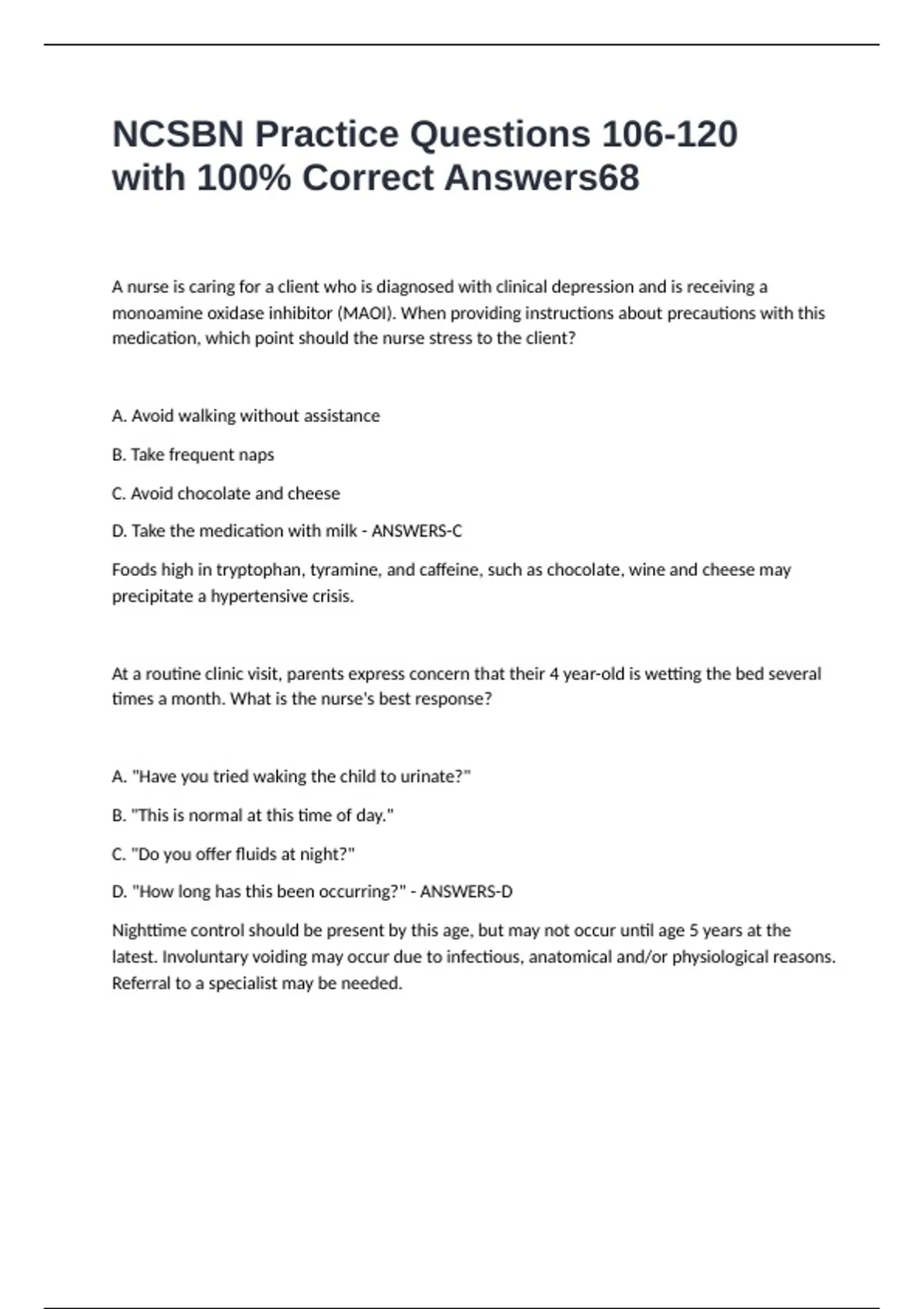 NCSBN Practice Questions 106-120 with 100% Correct Answers A nurse is caring for a client who is diagnosed with clinical depression and is receiving a monoamine oxidase inhibitor (MAOI). When providing instructions about precautions with this medication, which point should the nurse stress to the client? A. Avoid walking without assistance B. Take frequent naps C. Avoid chocolate and cheese D. Take the medication with milk - ANSWERS-C Foods high in tryptophan, tyramine, and caffeine, such as chocolate, wine and cheese may precipitate a hypertensive crisis. At a routine clinic visit, parents express concern that their 4 year-old is wetting the bed several times a month. What is the nurse's best response? A. "Have you tried waking the child to urinate?" B. "This is normal at this time of day." C. "Do you offer fluids at night?" D. "How long has this been occurring?" - ANSWERS-D Nighttime control should be present by this age, but may not occur until age 5 years at the latest. Involuntary voiding may occur due to infectious, anatomical and/or physiological reasons. Referral to a specialist may be needed.
