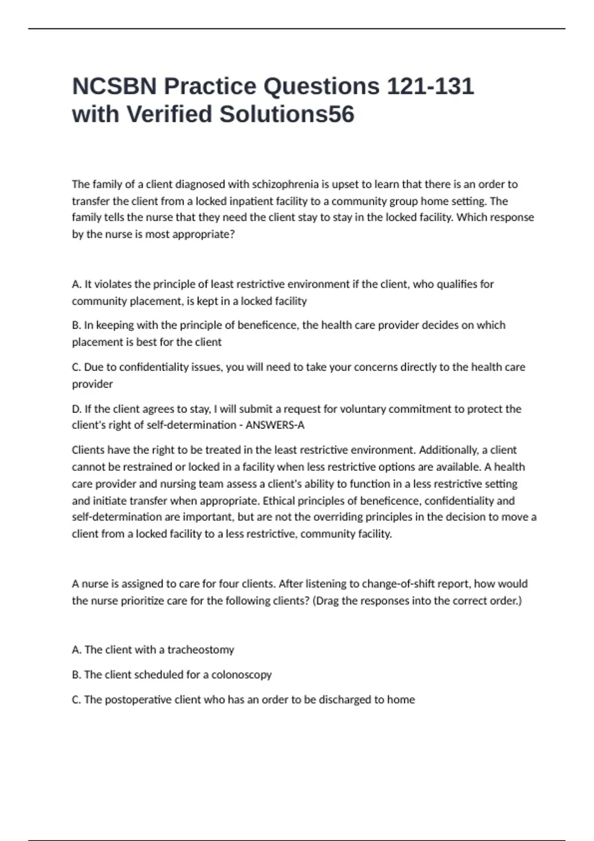 NCSBN Practice Questions 121-131 with Verified Solutions The family of a client diagnosed with schizophrenia is upset to learn that there is an order to transfer the client from a locked inpatient facility to a community group home setting. The family tells the nurse that they need the client stay to stay in the locked facility. Which response by the nurse is most appropriate? A. It violates the principle of least restrictive environment if the client, who qualifies for community placement, is kept in a locked facility B. In keeping with the principle of beneficence, the health care provider decides on which placement is best for the client C. Due to confidentiality issues, you will need to take your concerns directly to the health care provider D. If the client agrees to stay, I will submit a request for voluntary commitment to protect the client's right of self-determination - ANSWERS-A Clients have the right to be treated in the least restrictive environment. Additionally, a client cannot be restrained or locked in a facility when less restrictive options are available. A health care provider and nursing team assess a client's ability to function in a less restrictive setting and initiate transfer when appropriate. Ethical principles of beneficence, confidentiality and self-determination are important, but are not the overriding principles in the decision to move a client from a locked facility to a less restrictive, community facility. A nurse is assigned to care for four clients. After listening to change-of-shift report, how would the nurse prioritize care for the following clients? (Drag the responses into the correct order.) A. The client with a tracheostomy B. The client scheduled for a colonoscopy C. The postoperative client who has an order to be discharged to home