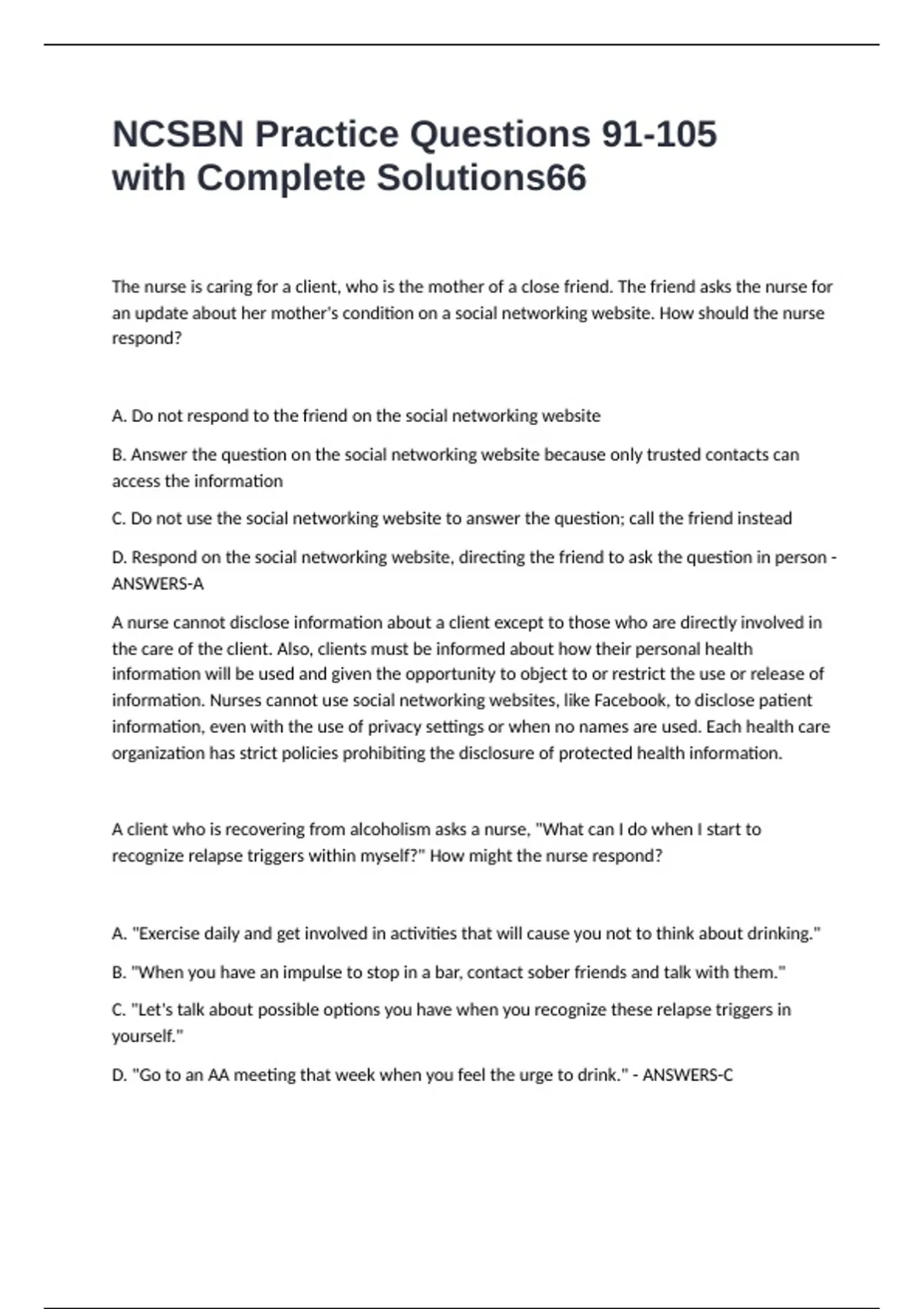NCSBN Practice Questions 91-105 with Complete Solutions The nurse is caring for a client, who is the mother of a close friend. The friend asks the nurse for an update about her mother's condition on a social networking website. How should the nurse respond? A. Do not respond to the friend on the social networking website B. Answer the question on the social networking website because only trusted contacts can access the information C. Do not use the social networking website to answer the question; call the friend instead D. Respond on the social networking website, directing the friend to ask the question in person - ANSWERS-A A nurse cannot disclose information about a client except to those who are directly involved in the care of the client. Also, clients must be informed about how their personal health information will be used and given the opportunity to object to or restrict the use or release of information. Nurses cannot use social networking websites, like Facebook, to disclose patient information, even with the use of privacy settings or when no names are used. Each health care organization has strict policies prohibiting the disclosure of protected health information. A client who is recovering from alcoholism asks a nurse, "What can I do when I start to recognize relapse triggers within myself?" How might the nurse respond? A. "Exercise daily and get involved in activities that will cause you not to think about drinking." B. "When you have an impulse to stop in a bar, contact sober friends and talk with them." C. "Let's talk about possible options you have when you recognize these relapse triggers in yourself." D. "Go to an AA meeting that week when you feel the urge to drink." - ANSWERS-C