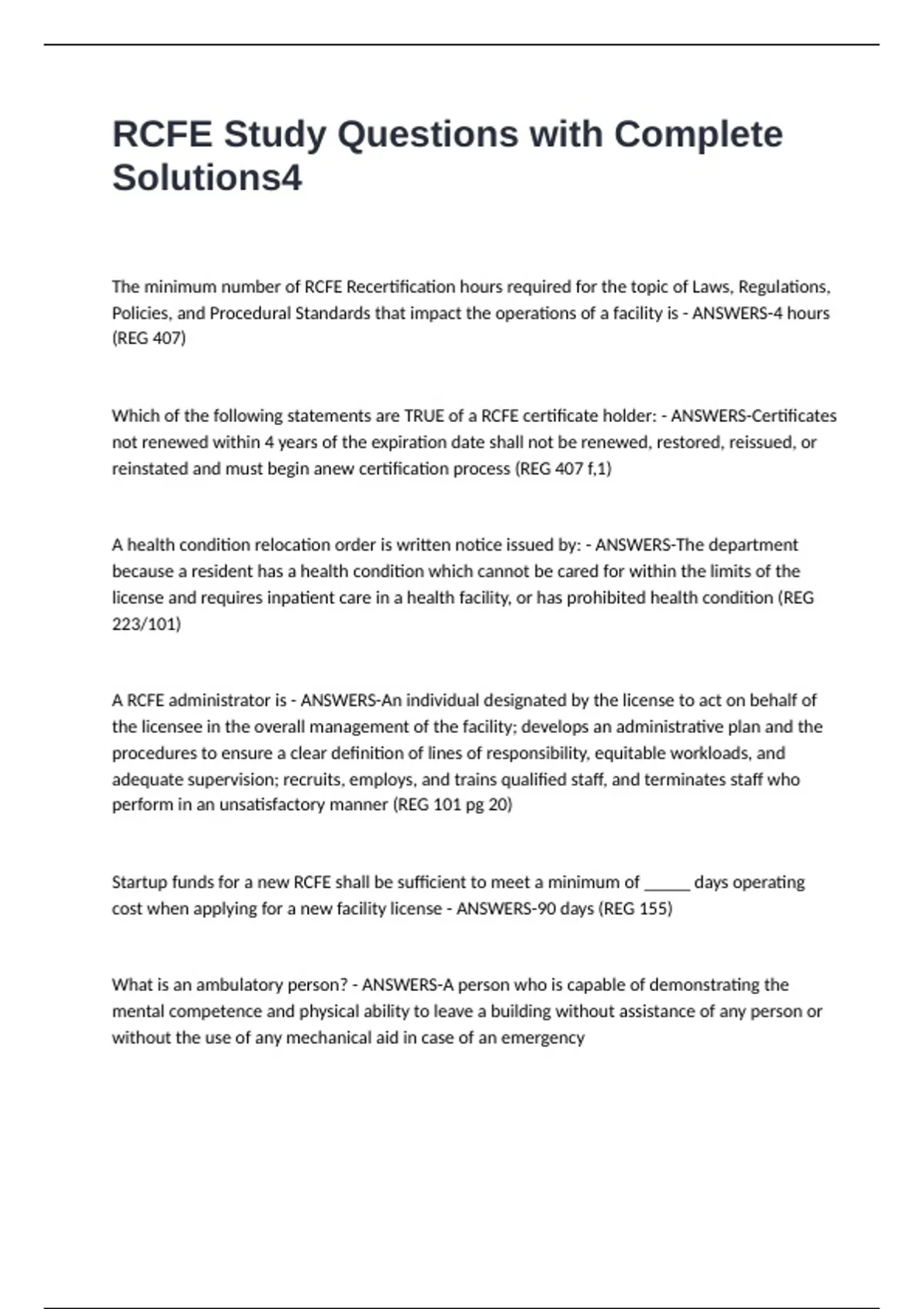 RCFE Study Questions with Complete Solutions The minimum number of RCFE Recertification hours required for the topic of Laws, Regulations, Policies, and Procedural Standards that impact the operations of a facility is - ANSWERS-4 hours (REG 407) Which of the following statements are TRUE of a RCFE certificate holder: - ANSWERS-Certificates not renewed within 4 years of the expiration date shall not be renewed, restored, reissued, or reinstated and must begin anew certification process (REG 407 f,1) A health condition relocation order is written notice issued by: - ANSWERS-The department because a resident has a health condition which cannot be cared for within the limits of the license and requires inpatient care in a health facility, or has prohibited health condition (REG 223/101) A RCFE administrator is - ANSWERS-An individual designated by the license to act on behalf of the licensee in the overall management of the facility; develops an administrative plan and the procedures to ensure a clear definition of lines of responsibility, equitable workloads, and adequate supervision; recruits, employs, and trains qualified staff, and terminates staff who perform in an unsatisfactory manner (REG 101 pg 20) Startup funds for a new RCFE shall be sufficient to meet a minimum of _____ days operating cost when applying for a new facility license - ANSWERS-90 days (REG 155) What is an ambulatory person? - ANSWERS-A person who is capable of demonstrating the mental competence and physical ability to leave a building without assistance of any person or without the use of any mechanical aid in case of an emergency