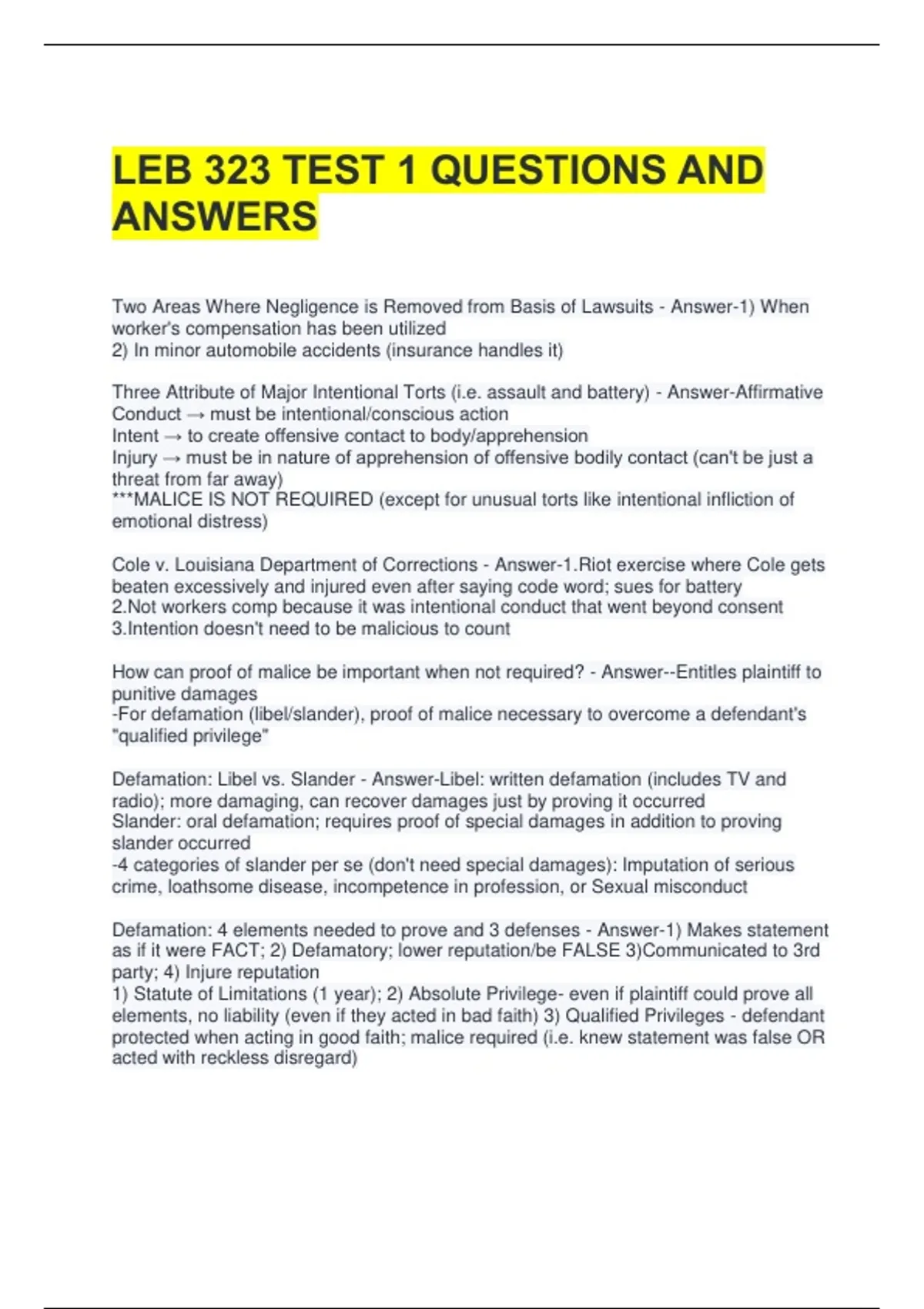Defamation: 4 elements needed to prove and 3 defenses - Answer-1) Makes statement