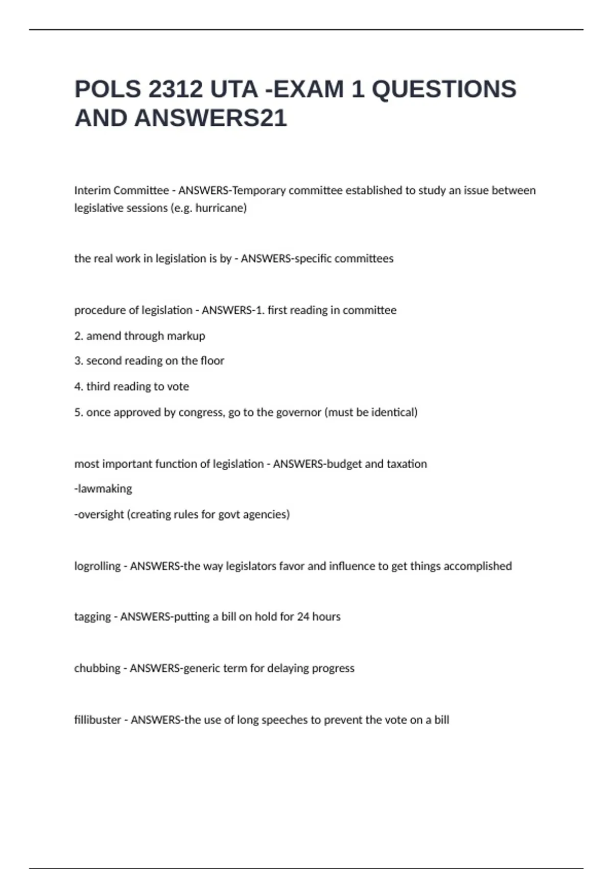 POLS 2312 UTA -EXAM 1 QUESTIONS AND ANSWERS Interim Committee - ANSWERS-Temporary committee established to study an issue between legislative sessions (e.g. hurricane) the real work in legislation is by - ANSWERS-specific committees procedure of legislation - ANSWERS-1. first reading in committee 2. amend through markup 3. second reading on the floor 4. third reading to vote 5. once approved by congress, go to the governor (must be identical) most important function of legislation - ANSWERS-budget and taxation -lawmaking -oversight (creating rules for govt agencies) logrolling - ANSWERS-the way legislators favor and influence to get things accomplished tagging - ANSWERS-putting a bill on hold for 24 hours chubbing - ANSWERS-generic term for delaying progress fillibuster - ANSWERS-the use of long speeches to prevent the vote on a bill