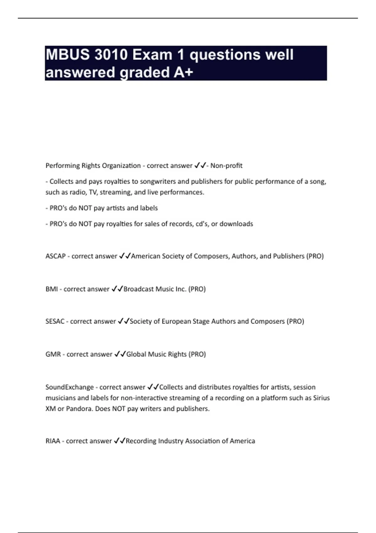 Performing Rights Organization - correct answer ✔✔- Non-profit