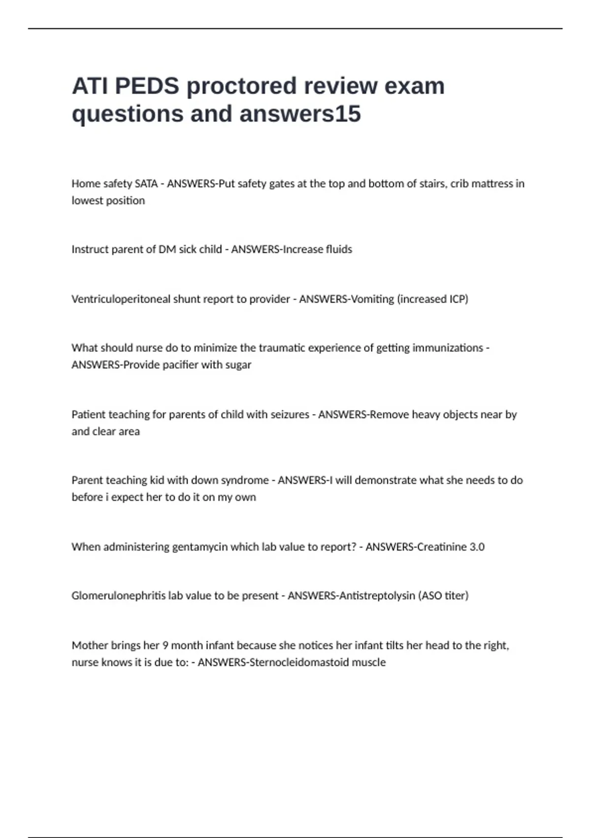 ATI PEDS proctored review exam questions and answers Home safety SATA - ANSWERS-Put safety gates at the top and bottom of stairs, crib mattress in lowest position Instruct parent of DM sick child - ANSWERS-Increase fluids Ventriculoperitoneal shunt report to provider - ANSWERS-Vomiting (increased ICP) What should nurse do to minimize the traumatic experience of getting immunizations - ANSWERS-Provide pacifier with sugar Patient teaching for parents of child with seizures - ANSWERS-Remove heavy objects near by and clear area Parent teaching kid with down syndrome - ANSWERS-I will demonstrate what she needs to do before i expect her to do it on my own When administering gentamycin which lab value to report? - ANSWERS-Creatinine 3.0 Glomerulonephritis lab value to be present - ANSWERS-Antistreptolysin (ASO titer) Mother brings her 9 month infant because she notices her infant tilts her head to the right, nurse knows it is due to: - ANSWERS-Sternocleidomastoid muscle