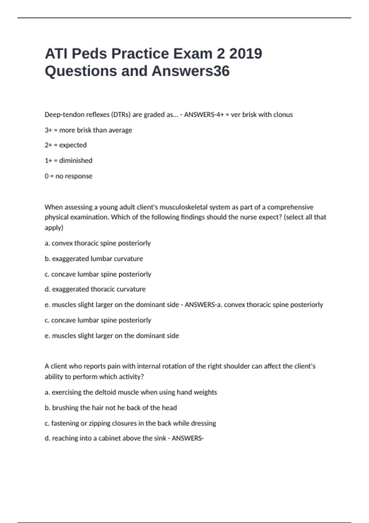 ATI Peds Practice Exam 2 2019 Questions and Answers Deep-tendon reflexes (DTRs) are graded as... - ANSWERS-4+ = ver brisk with clonus 3+ = more brisk than average 2+ = expected 1+ = diminished 0 = no response When assessing a young adult client's musculoskeletal system as part of a comprehensive physical examination. Which of the following findings should the nurse expect? (select all that apply) a. convex thoracic spine posteriorly b. exaggerated lumbar curvature c. concave lumbar spine posteriorly d. exaggerated thoracic curvature e. muscles slight larger on the dominant side - ANSWERS-a. convex thoracic spine posteriorly c. concave lumbar spine posteriorly e. muscles slight larger on the dominant side A client who reports pain with internal rotation of the right shoulder can affect the client's ability to perform which activity? a. exercising the deltoid muscle when using hand weights b. brushing the hair not he back of the head c. fastening or zipping closures in the back while dressing d. reaching into a cabinet above the sink - ANSWERS-