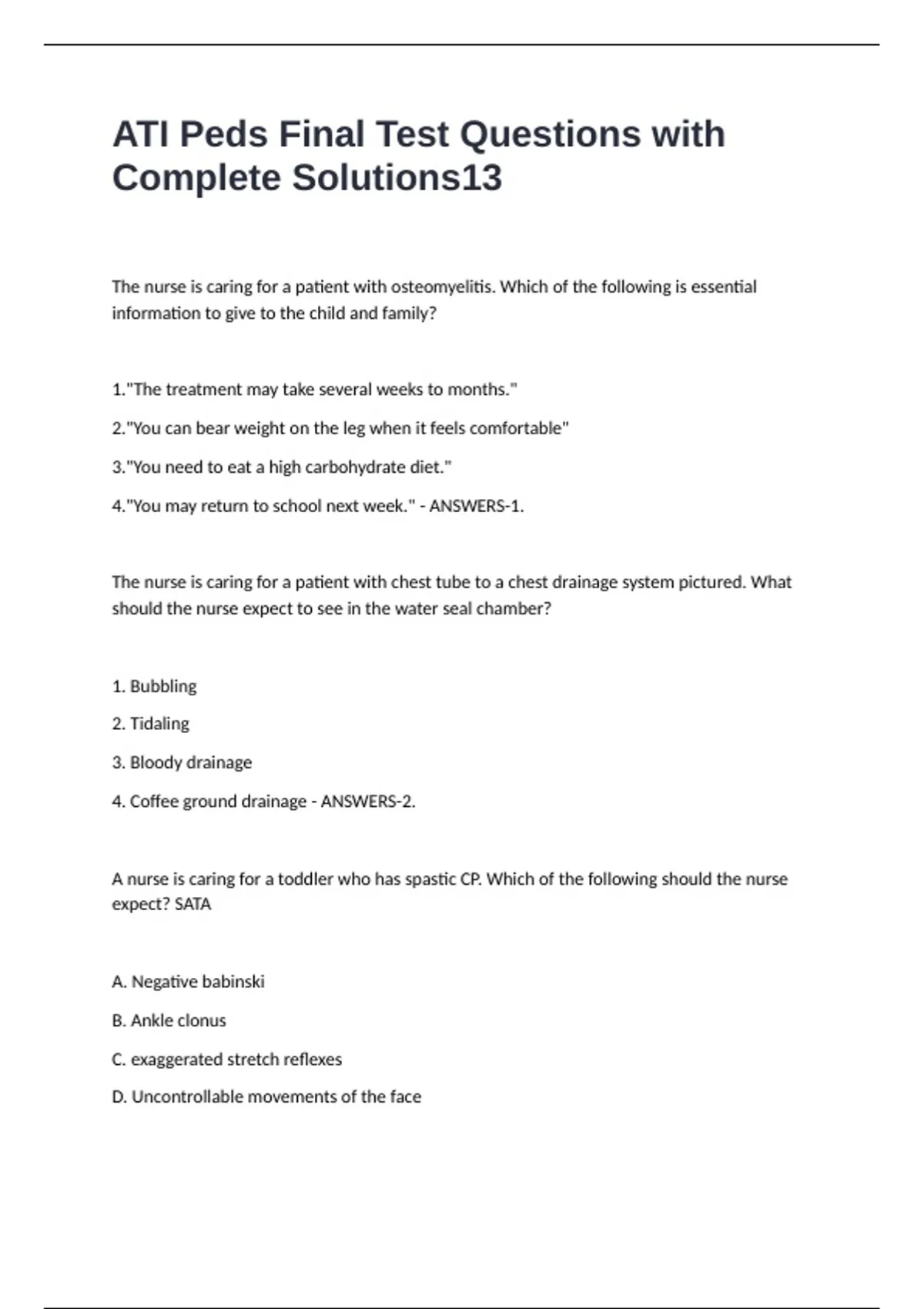 ATI Peds Final Test Questions with Complete Solutions The nurse is caring for a patient with osteomyelitis. Which of the following is essential information to give to the child and family? 1."The treatment may take several weeks to months." 2."You can bear weight on the leg when it feels comfortable" 3."You need to eat a high carbohydrate diet." 4."You may return to school next week." - ANSWERS-1. The nurse is caring for a patient with chest tube to a chest drainage system pictured. What should the nurse expect to see in the water seal chamber? 1. Bubbling 2. Tidaling 3. Bloody drainage 4. Coffee ground drainage - ANSWERS-2. A nurse is caring for a toddler who has spastic CP. Which of the following should the nurse expect? SATA A. Negative babinski B. Ankle clonus C. exaggerated stretch reflexes D. Uncontrollable movements of the face