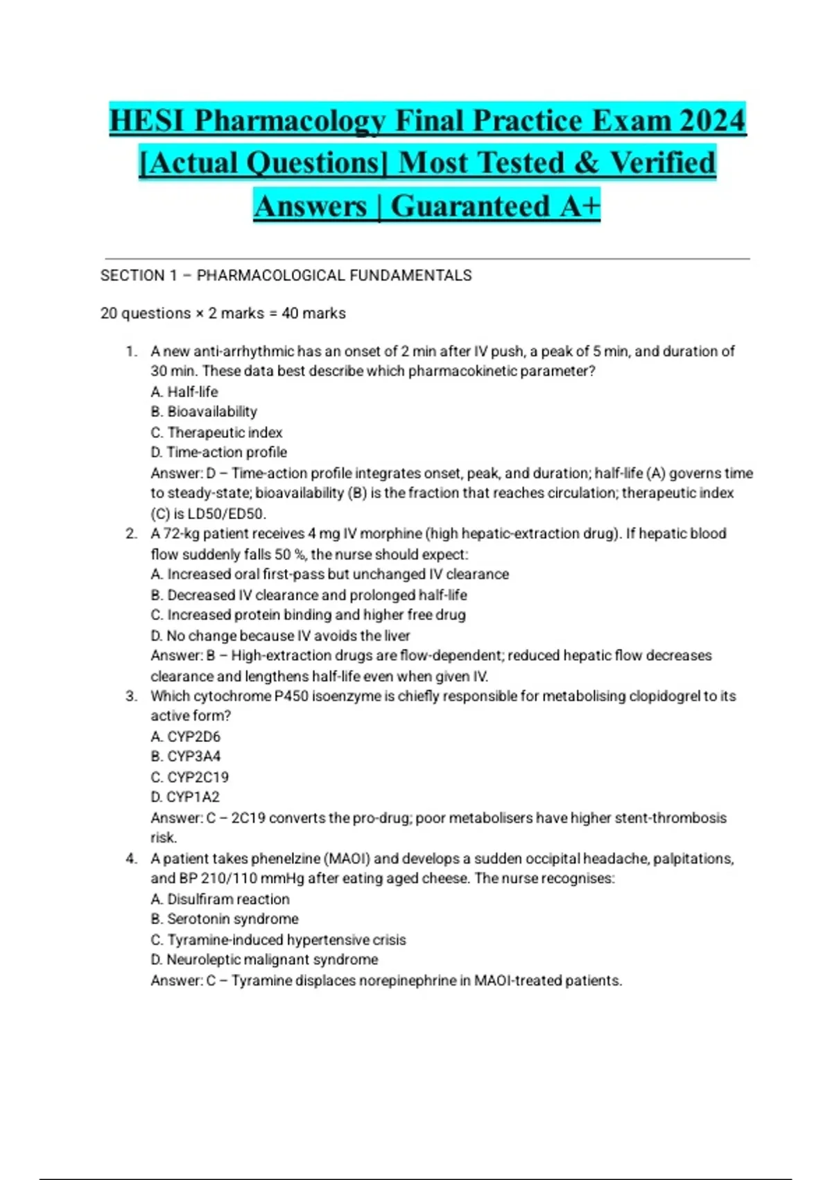 HESI Pharmacology Final Practice Exam 2024 [Actual Questions] Most Tested & Verified Answers | Guaranteed A+