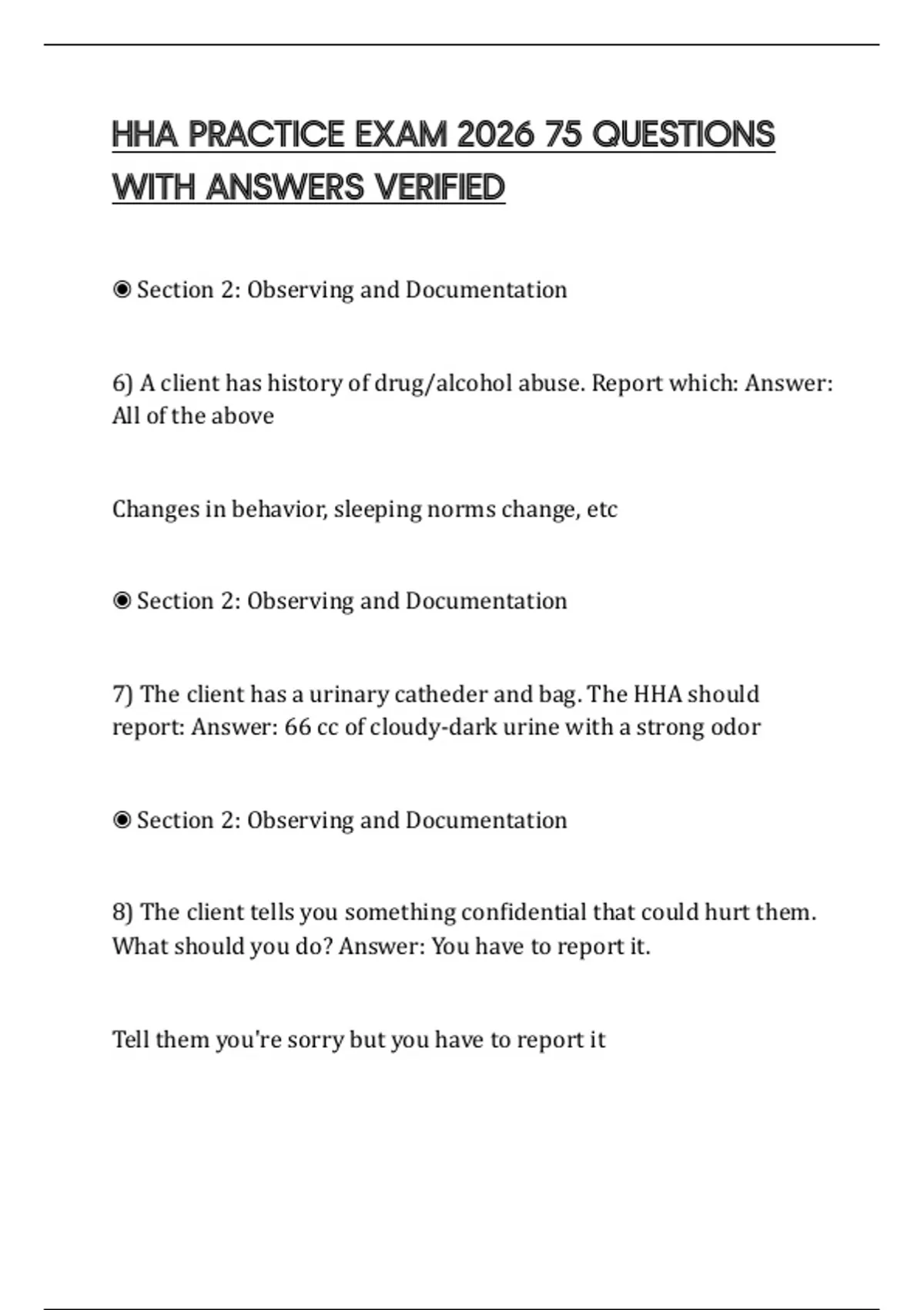 HHA PRACTICE EXAM 2026 75 QUESTIONS WITH ANSWERS VERIFIED