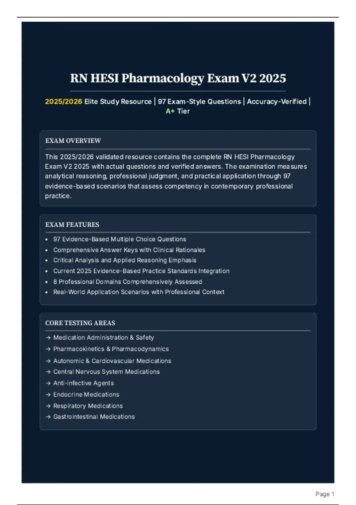 This document contains the complete RN HESI Pharmacology Exam V2 2025 prep guide for the 2025/2026 cycle. It features 97 exam-style multiple-choice questions with accuracy-verified answers and detailed rationales. Content is aligned with current evidence-based practice standards and covers eight major domains: medication administration & safety, pharmacokinetics & pharmacodynamics, autonomic & cardiovascular medications, central nervous system medications, anti-infective agents, endocrine medications, respiratory medications, and gastrointestinal medications. Each question is explained step-by-step to reinforce safe medication practices, clinical reasoning, and exam readiness. Perfect for RN students preparing for the HESI Pharmacology exam or strengthening their comprehensive pharmacology knowledge base.