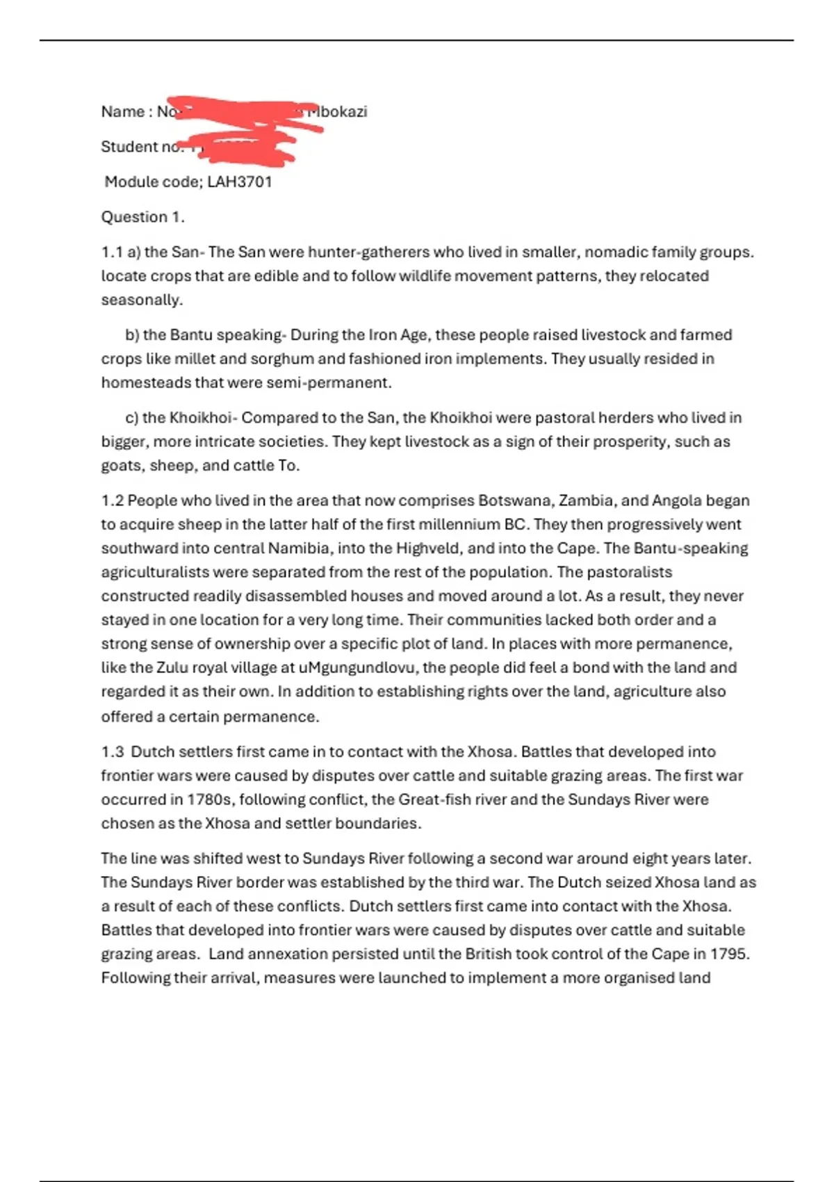 1.3 Dutch settlers first came in to contact with the Xhosa. Battles that developed into