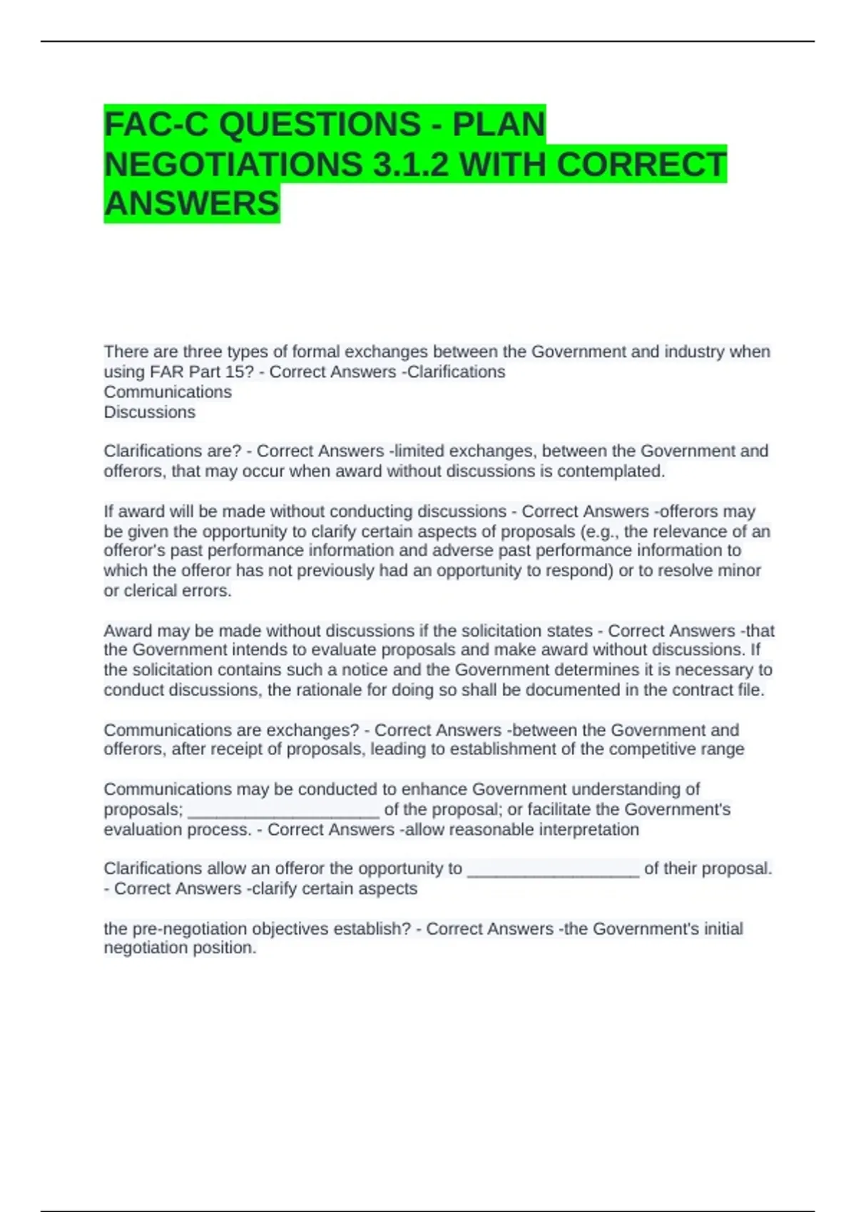 FAC-C QUESTIONS - PLAN NEGOTIATIONS 3.1.2 WITH CORRECT ANSWERS