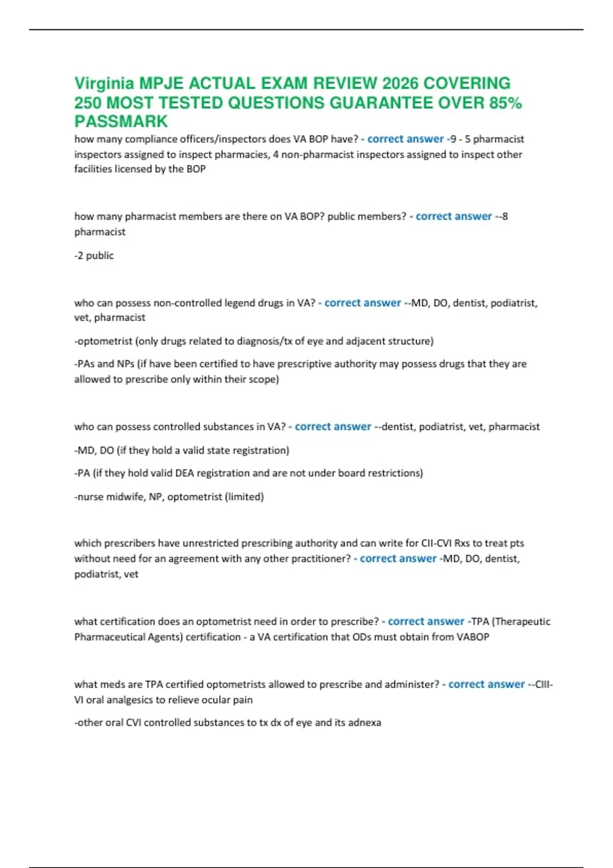 Virginia MPJE ACTUAL EXAM REVIEW 2026 COVERING 250 MOST TESTED QUESTIONS GUARANTEE OVER 85% PASSMARK