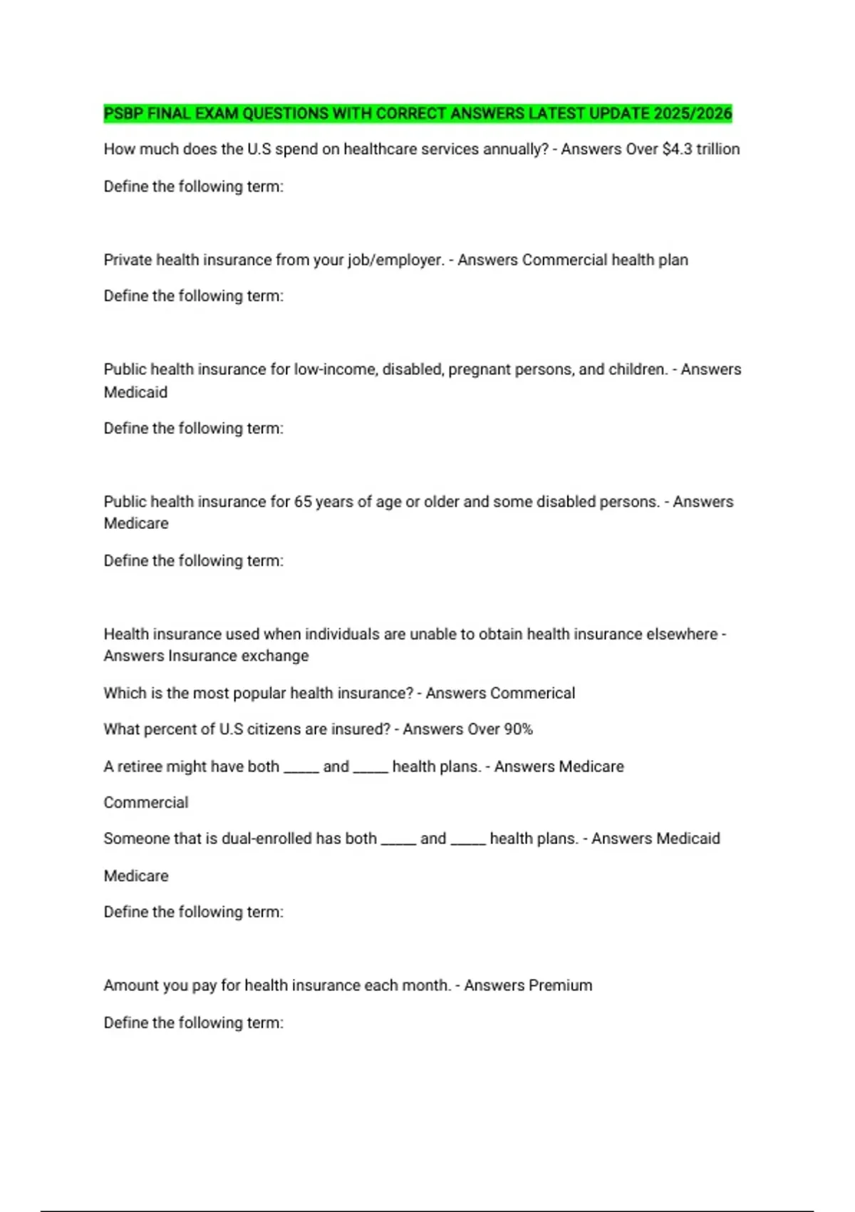 PSBP FINAL EXAM QUESTIONS WITH CORRECT ANSWERS LATEST UPDATE 2025/2026 How much does the U.S spend on healthcare services annually? - Answers Over $4.3 trillion Define the following term: Private health insurance from your job/employer. - Answers Commercial health plan Define the following term: Public health insurance for low-income, disabled, pregnant persons, and children. - Answers Medicaid Define the following term: Public health insurance for 65 years of age or older and some disabled persons. - Answers Medicare Define the following term: Health insurance used when individuals are unable to obtain health insurance elsewhere - Answers Insurance exchange Which is the most popular health insurance? - Answers Commerical What percent of U.S citizens are insured? - Answers Over 90% A retiree might have both _____ and _____ health plans. - Answers Medicare Commercial Someone that is dual-enrolled has both _____ and _____ health plans. - Answers Medicaid Medicare Define the following term: Amount you pay for health insurance each month. - Answers Premium Define the following term: Amount you pay out of pocked before health insurance benefits kick in. - Answers Deductible Define the following term: Fixed amount you pay for services after meeting your deductible. - Answers Copay Define the following term: Percentage of costs you pay for services after meeting your deductible - Answers Co-insurance Define the following term: Administrator of prescription coverage benefits from plan payers. - Answers Pharmacy benefits manager (PBM) Define the following term: The pharmaceutical company/industry. - Answers Pharma Define the following term: Price concession paid by Pharm. - Answers Rebate Define the following term: Someone who has an interest in something. - Answers Stakeholder _____ benefits are services for medical expenses. _____ benefits are services for covered prescription medications. - Answers Medical Pharmacy Define the following term: A list of doctors, pharmacies, and hospitals that are covered by the payer. - Answers Network Define the following term: The process that applies business principles to healthcare. - Answers Managed care Define the following term: Most restrictive healthcare plan with low premiums. - Answers Health maintenance organization (HMO) Define the following term: Least restrictive healthcare plan with high premiums. - Answers Preferred provider organization (PPO) True/False: EPOs and POSs are hydrids of HMOs and PPOs. - Answers True What does EPO stand for?