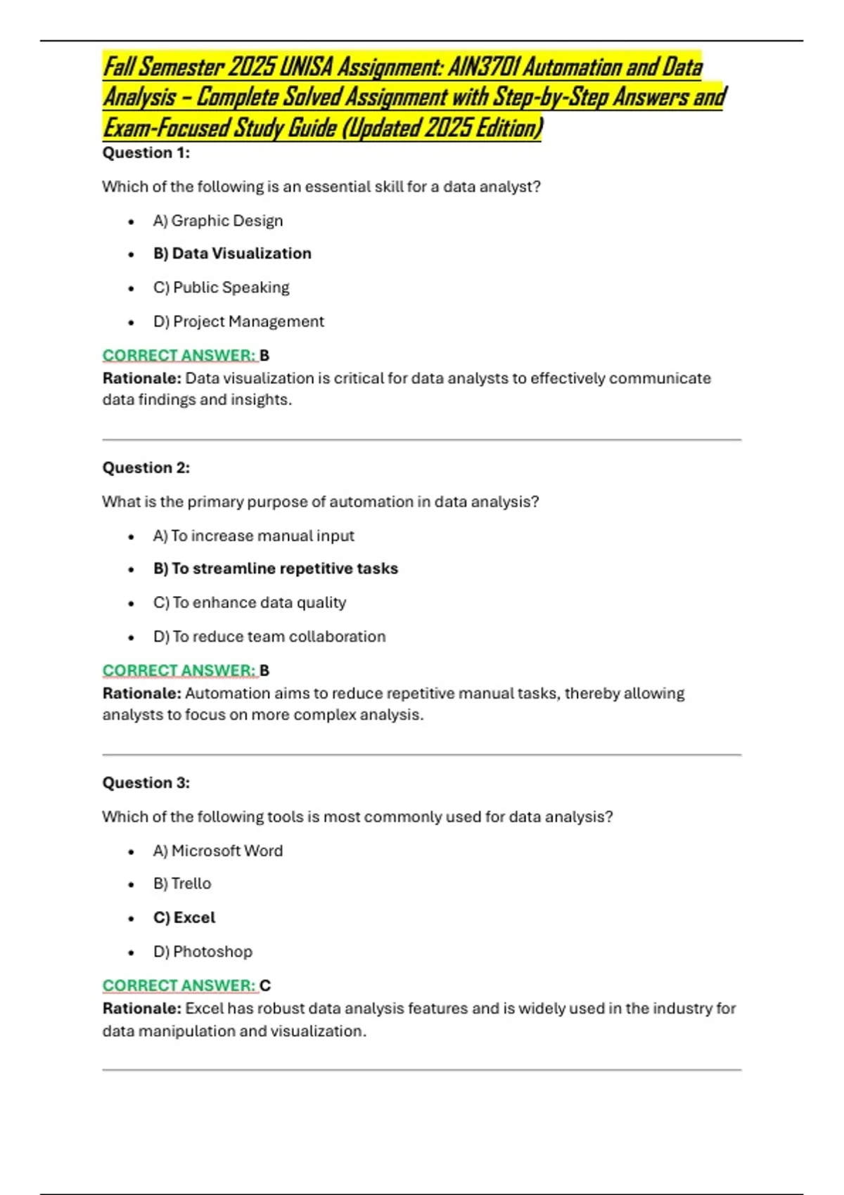 This Fall Semester 2025 UNISA AIN3701 Automation and Data Analysis assignment provides a fully solved, exam-focused resource aligned with the latest UNISA curriculum. Updated for 2025, it covers essential topics such as automation concepts, data collection and processing, analytical methods, basic scripting and tool usage, and interpretation of data-driven insights. Presented with clear step-by-step answers and structured explanations, this guide is designed to support accurate assignment completion, efficient revision, and confident exam preparation, helping students develop practical automation and data analysis skills and achieve higher marks.