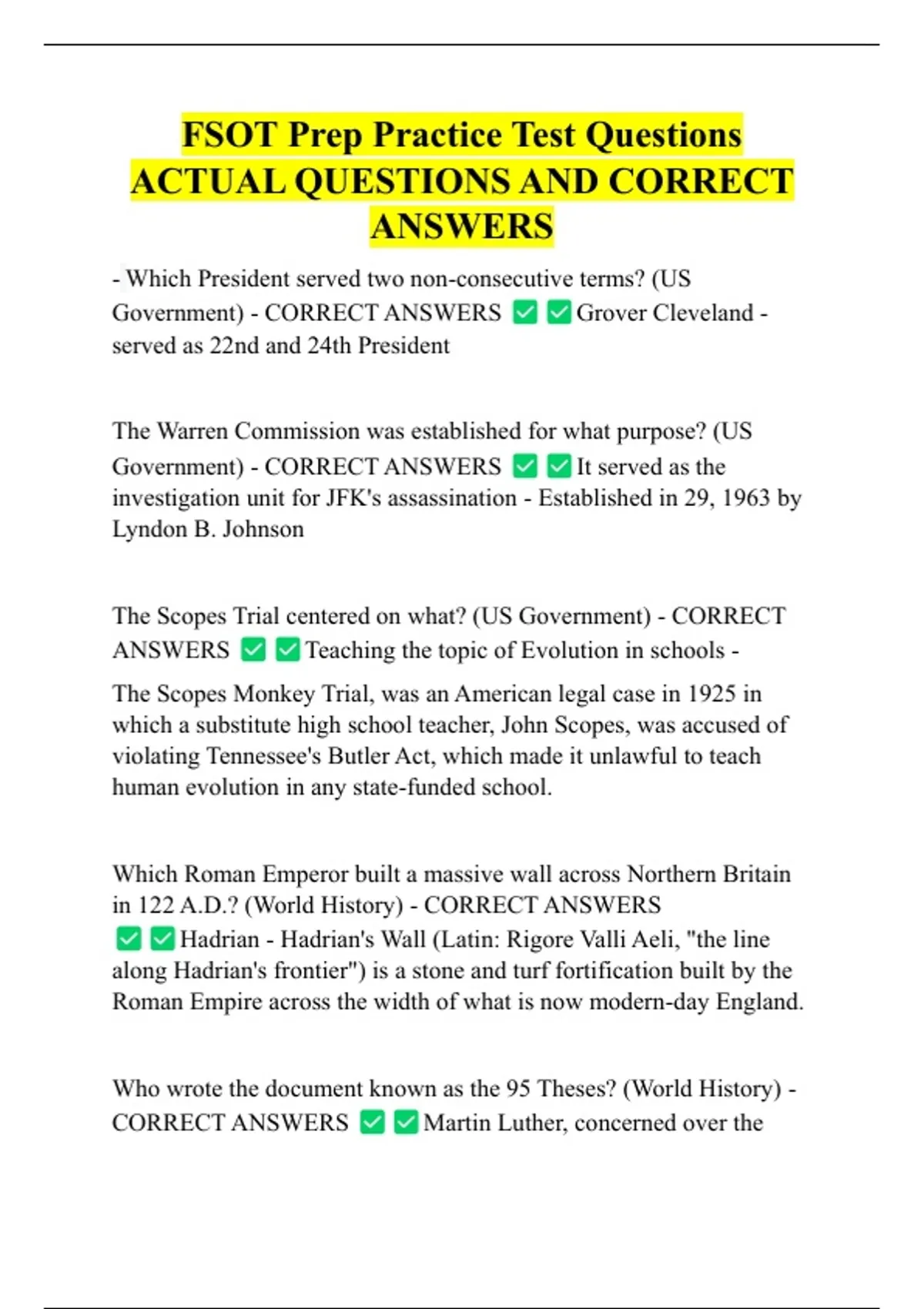 FSOT Prep Practice Test Questions ACTUAL QUESTIONS AND CORRECT ANSWERS - Which President served two non-consecutive terms? (US Government) - CORRECT ANSWERS served as 22nd and 24th President