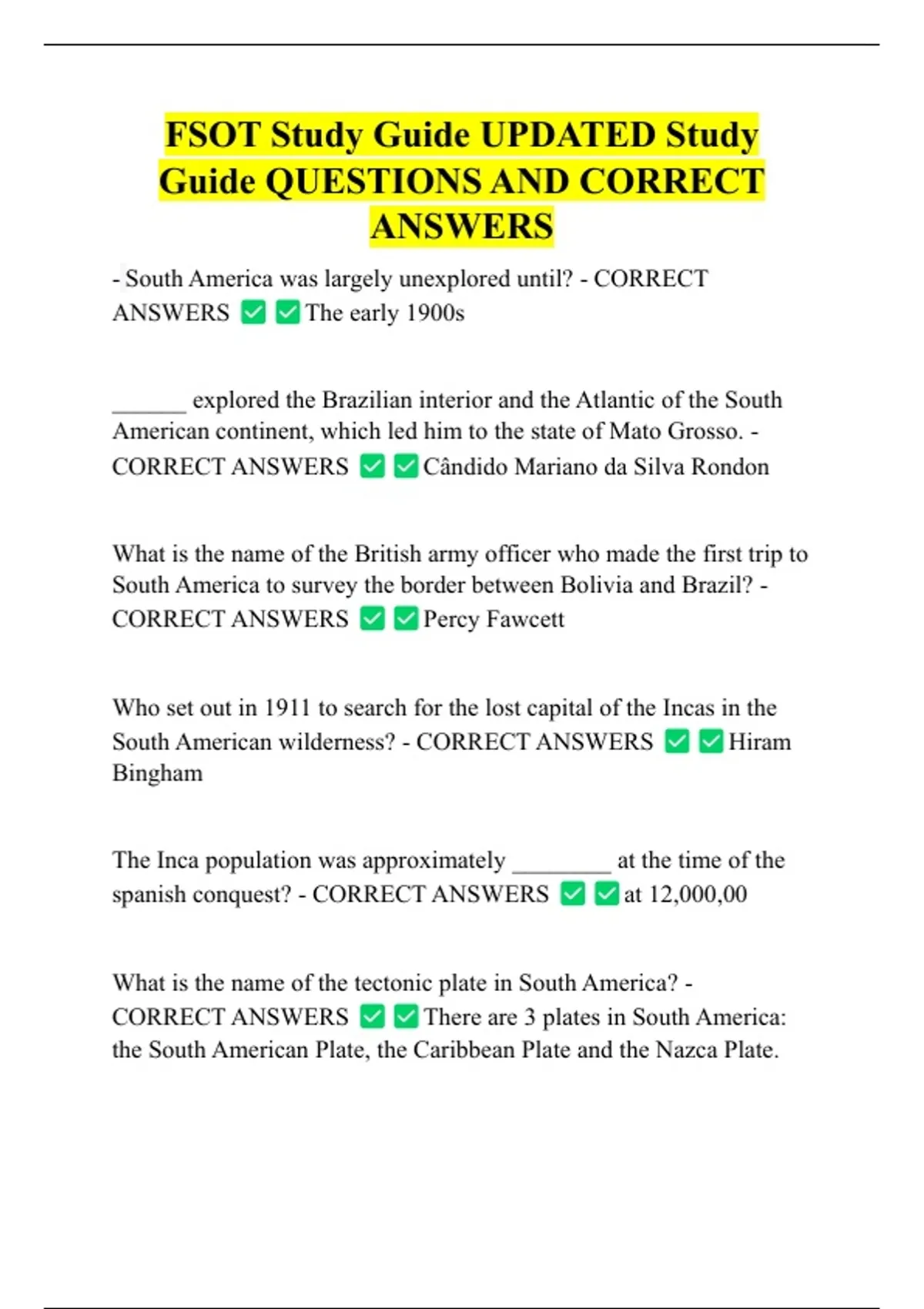FSOT Study Guide UPDATED Study Guide QUESTIONS AND CORRECT ANSWERS - South America was largely unexplored until? - CORRECT ANSWERS The early 1900s