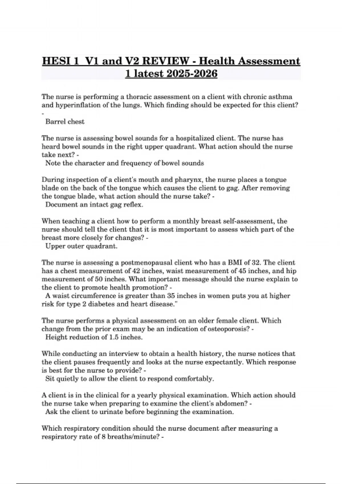 HESI 1 V1 and V2 REVIEW - Health Assessment 1 latest V1 and V2 REVIEW - Health Assessment 1 latest
