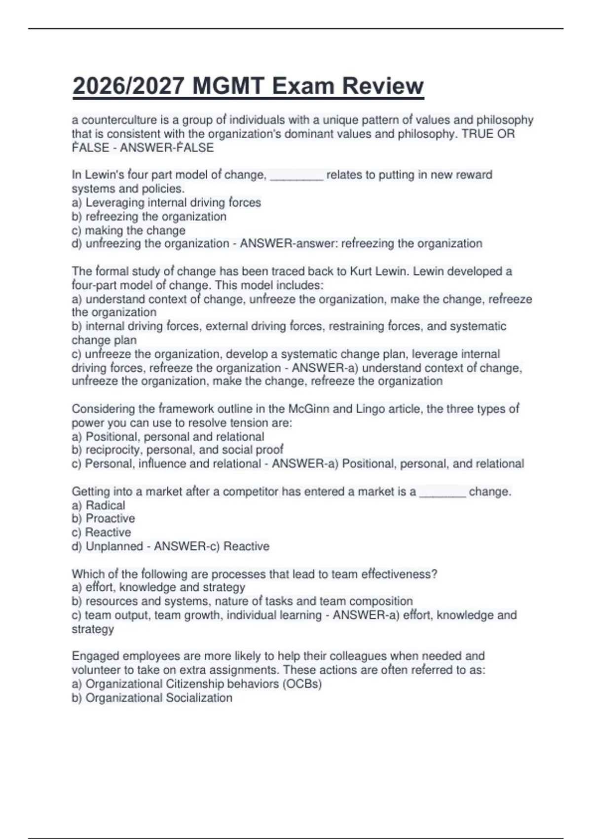 ,c) Management by Objectives (MBO) - ANSWER-a) Organizational Citizenship