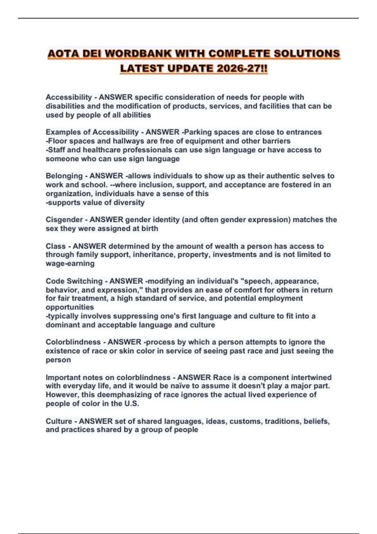 AOTA DEI WORDBANK WITH COMPLETE SOLUTIONS LATEST UPDATE 2026-27!!...