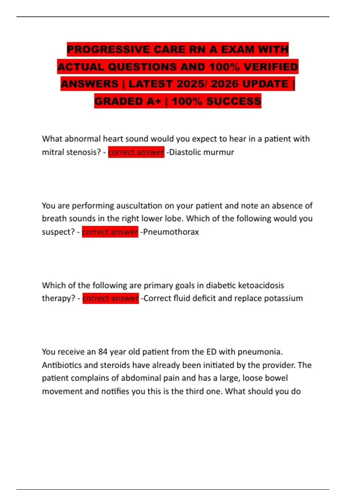PROGRESSIVE CARE RN A EXAM WITH ACTUAL QUESTIONS AND 100% VERIFIED ANSWERS | LATEST 2025/ 2026 UPDATE | GRADED A+ | 100% SUCCESS