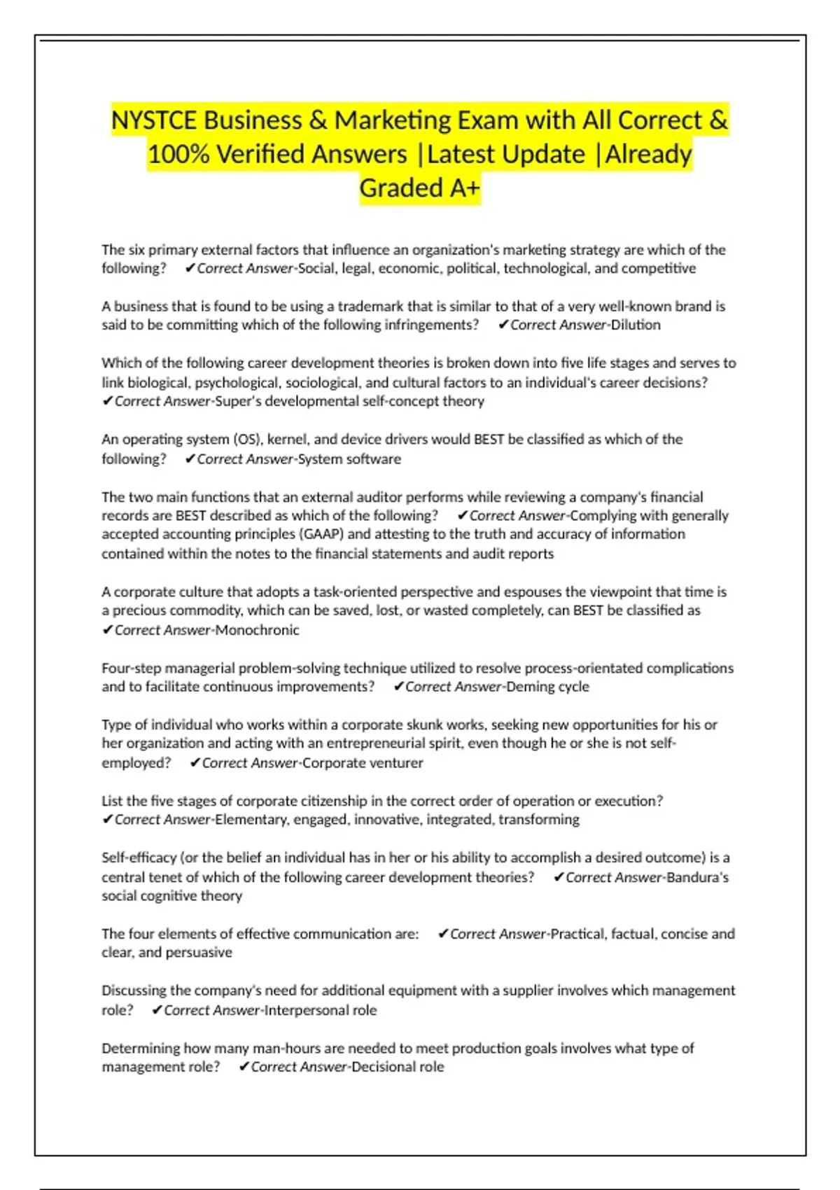 NYSTCE Business & Marketing Exam with All Correct & 100% Verified Answers |Latest Update |Already Graded A+