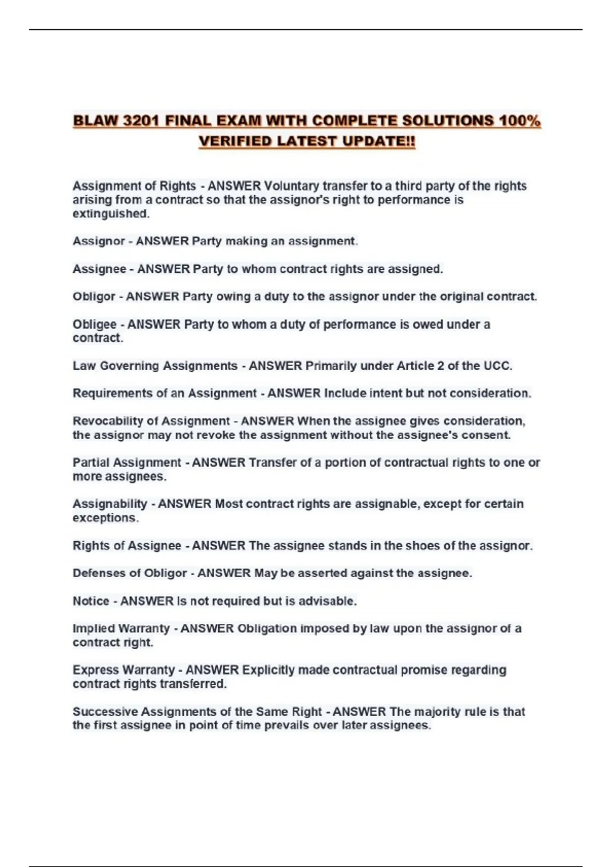 BLAW 3201 FINAL EXAM WITH COMPLETE SOLUTIONS 100% VERIFIED LATEST UPDATE!!...