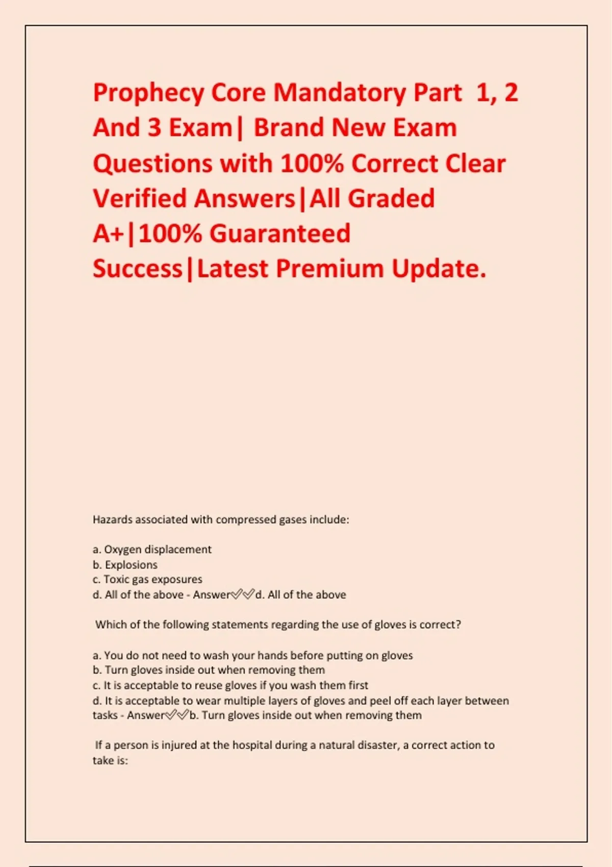 Prophecy Core Mandatory Part 1, 2 And 3 Exam| Brand New Exam Questions with 100% Correct Clear Verified Answers|All Graded A+|100% Guaranteed Success|Latest Premium Update. Hazards associated with compressed gases include: a. Oxygen displacement b. Explosions c. Toxic gas exposures d. All of the above - Answerd. All of the above Which of the following statements regarding the use of gloves is correct? a. You do not need to wash your hands before putting on gloves b. Turn gloves inside out when removing them c. It is acceptable to reuse gloves if you wash them first d. It is acceptable to wear multiple layers of gloves and peel off each layer between tasks - Answerb. Turn gloves inside out when removing them If a person is injured at the hospital during a natural disaster, a correct action to take is: a. Turn a person with a head injury onto his or her back b. Use a wheelchair or a stretcher to take the person to the Emergency Department for treatment c. Report the accident only if the person had to go to the Emergency Department d. Try to move the person yourself - Answera. Turn a person with a head injury onto his or her back Before you use a chemical product, you must know certain important information about it. Which of the choices below is information you do NOT need to know? a. Proper use of the product b. What chemicals the product contains c. Treatment if accidentally exposed to it d. Precautions for safe handling - Answerb. What chemicals the product contains Healthcare workers who must comply with HIPAA privacy requirements are: a. Doctors, nurses, and others providing direct patient care b. Environmental Services staff c. Engineering staff d. All of the above - Answerd. All of the above Which of the following is NOT required on a chemical label? a. A signal word b. Your facility's name c. A hazard statement d. A pictogram - Answerb. Your facility's name The acronym P.A.S.S. is used to help remember: a. How to use a fire extinguisher b. How to evacuate patients c. How to spread the word about a fire d. None of the above - Answera. How to use a fire extinguisher When lifting something off the ground, which part of your body should you always use? a. Back b. Abdominals c. Arms d. Legs - Answerd. Legs Which of the following statements regarding electrical safety is correct? a. Do not roll equipment over electrical cords because it can damage the cord b. It is acceptable to use a plug with a loose or broken pin as long as the device works c. Adaptors that convert three-pin plugs to two-pin plugs are safe to use d. Equipment should be unplugged by pulling the cord, not the plug - Answera. Do not roll equipment over electrical cords because it can damage the cord Placing a patient on Contact Precautions means that everyone must: a. Wear appropriate Personal Protective Equipment (PPE) such as gowns and gloves b. Wear a respirator c. Care for the patient in an airborne infection isolation room (AIIR) d. All of the above - Answera. Wear appropriate Personal Protective Equipment (PPE) such as gowns and gloves When mobilizing a weak or unsteady patient, which technique(s) should you consider? a. Using a transfer belt (gait belt) b. Using a mechanical lift, roller board, sliding board, flexible patient mover, or sling c. Having an assistant help you d. All of the above - Answerd. All of the above Which of the following would be considered an internal disaster rather than an external one? a. Earthquake b. Hurricane c. Flood d. Bomb threat - Answerd. Bomb threat