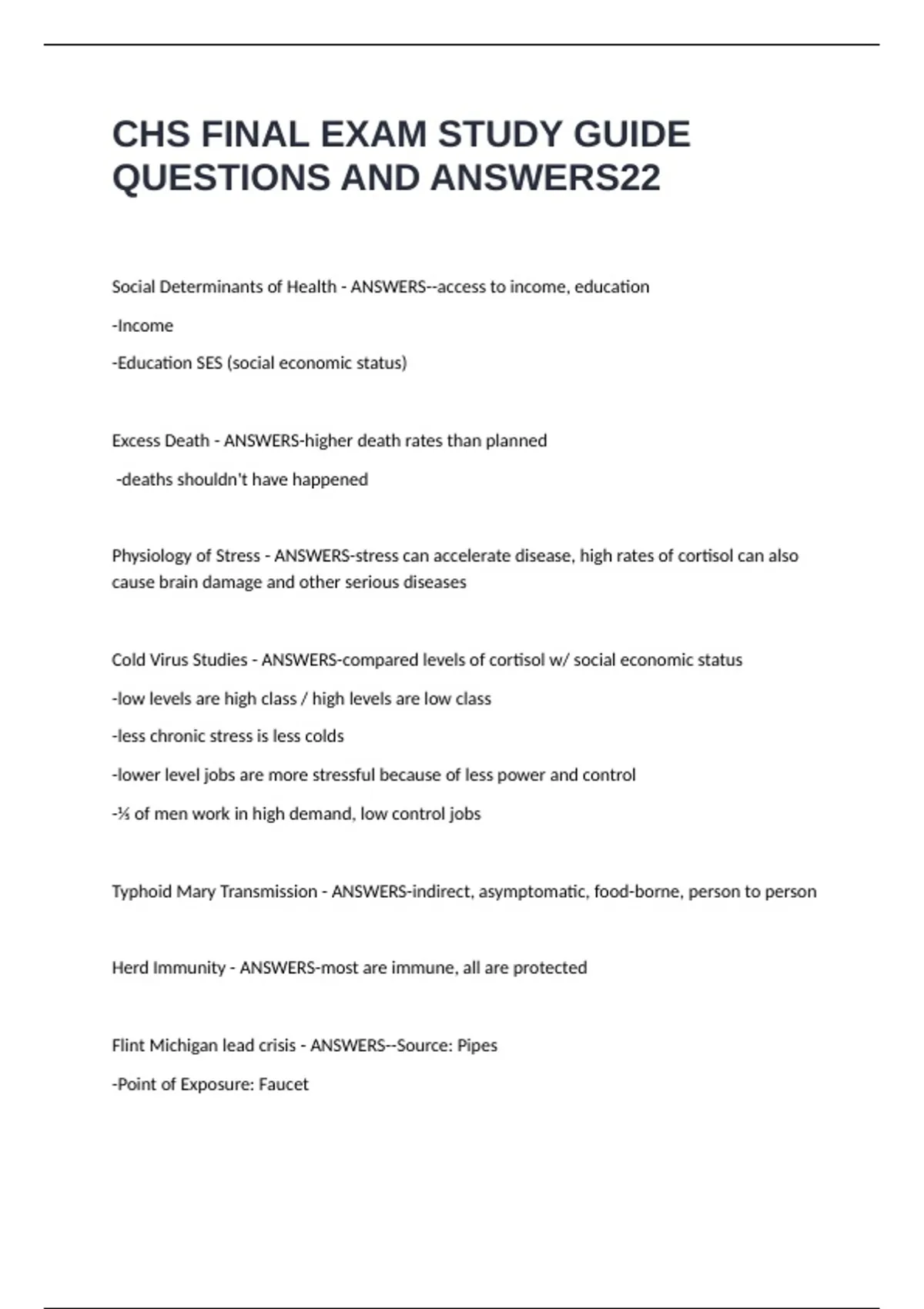 CHS FINAL EXAM STUDY GUIDE QUESTIONS AND ANSWERS