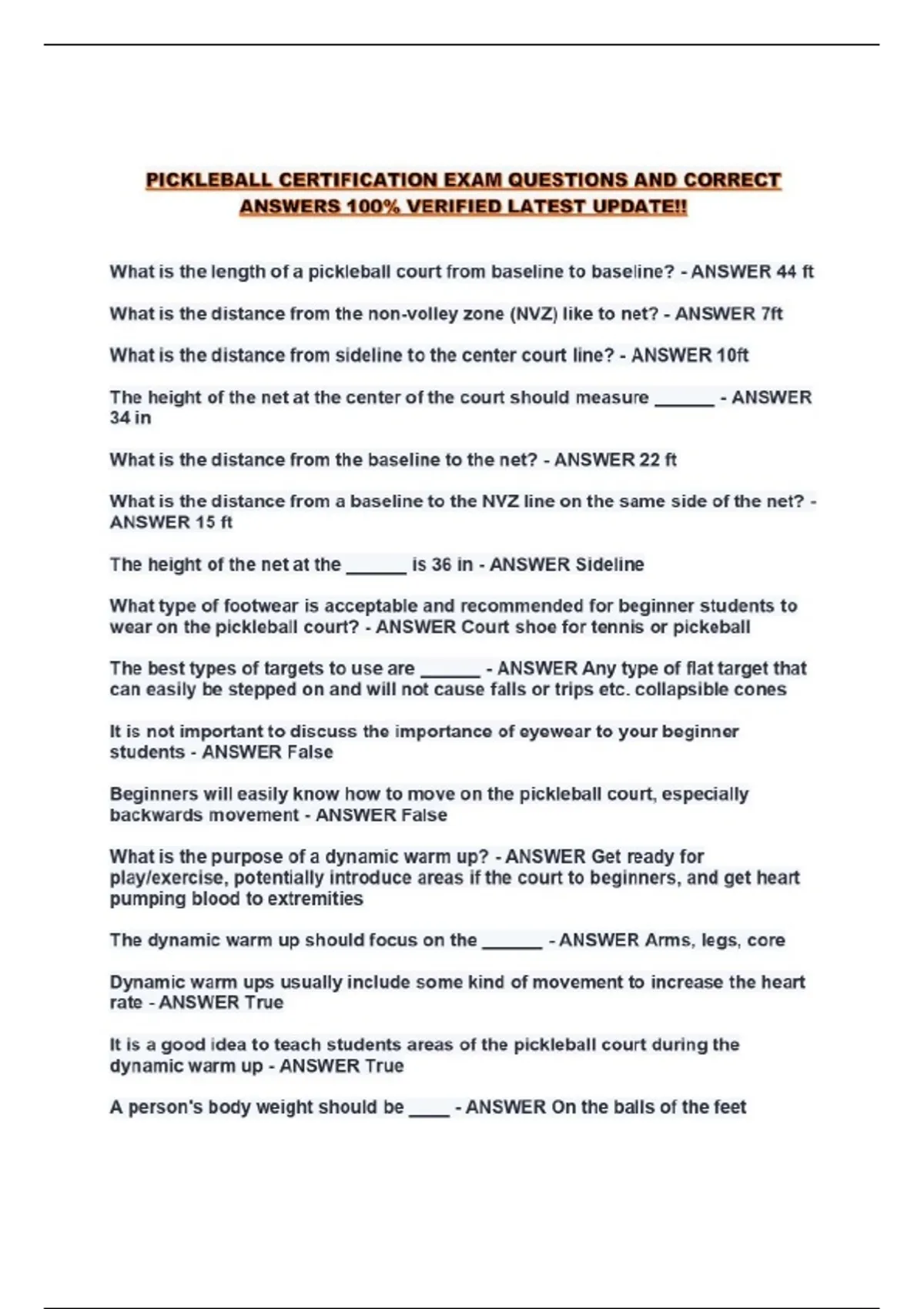 PICKLEBALL CERTIFICATION EXAM QUESTIONS AND CORRECT ANSWERS 100% VERIFIED LATEST UPDATE!!...
