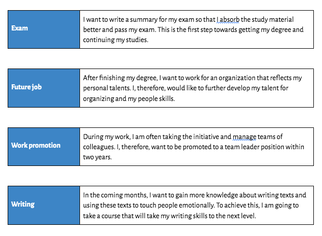 - Work promotion → "During my work, I am often taking the initiative and manage teams of colleagues. I, therefore, want to be promoted to a team leader position within two years";