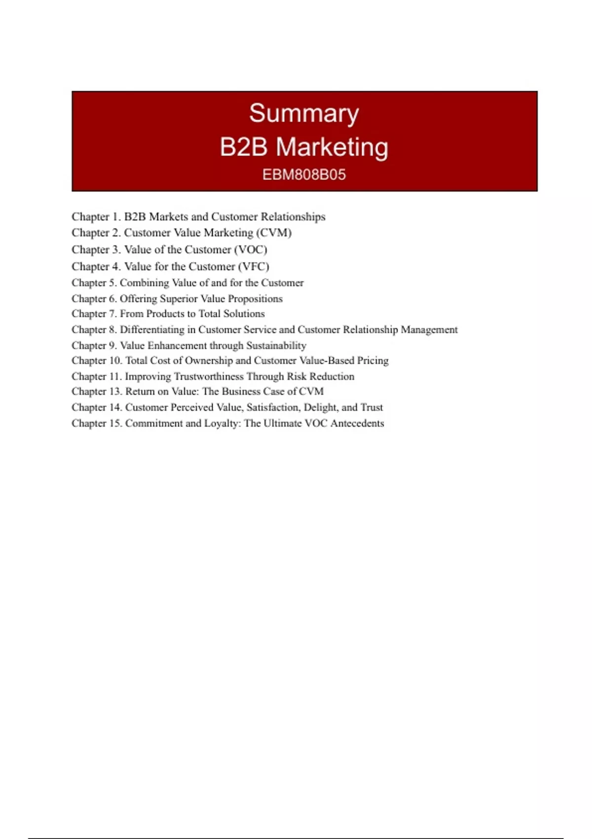 (Book) Summary B2B (EBM808B05) - All mandatory chapters (B2B Customer Value Marketing - the essentials)
