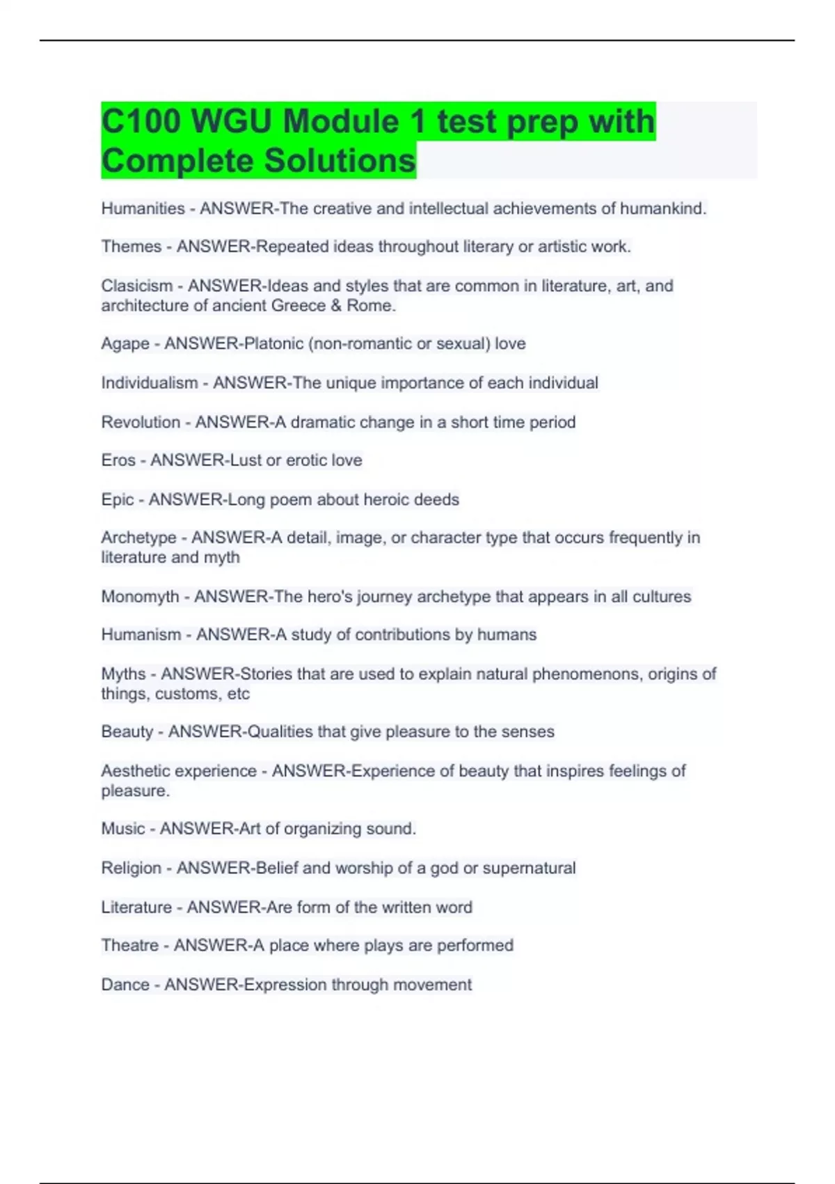 C100 WGU Module 1 test prep with Complete Solutions WGU C100 Introduction to Humanities Exam Solved 100% Correct WGU C100 Humanities Exam-Solved WGU C100 Humanities Test Latest Updated WGU C100 OA 2022/2023 with Complete Solutions