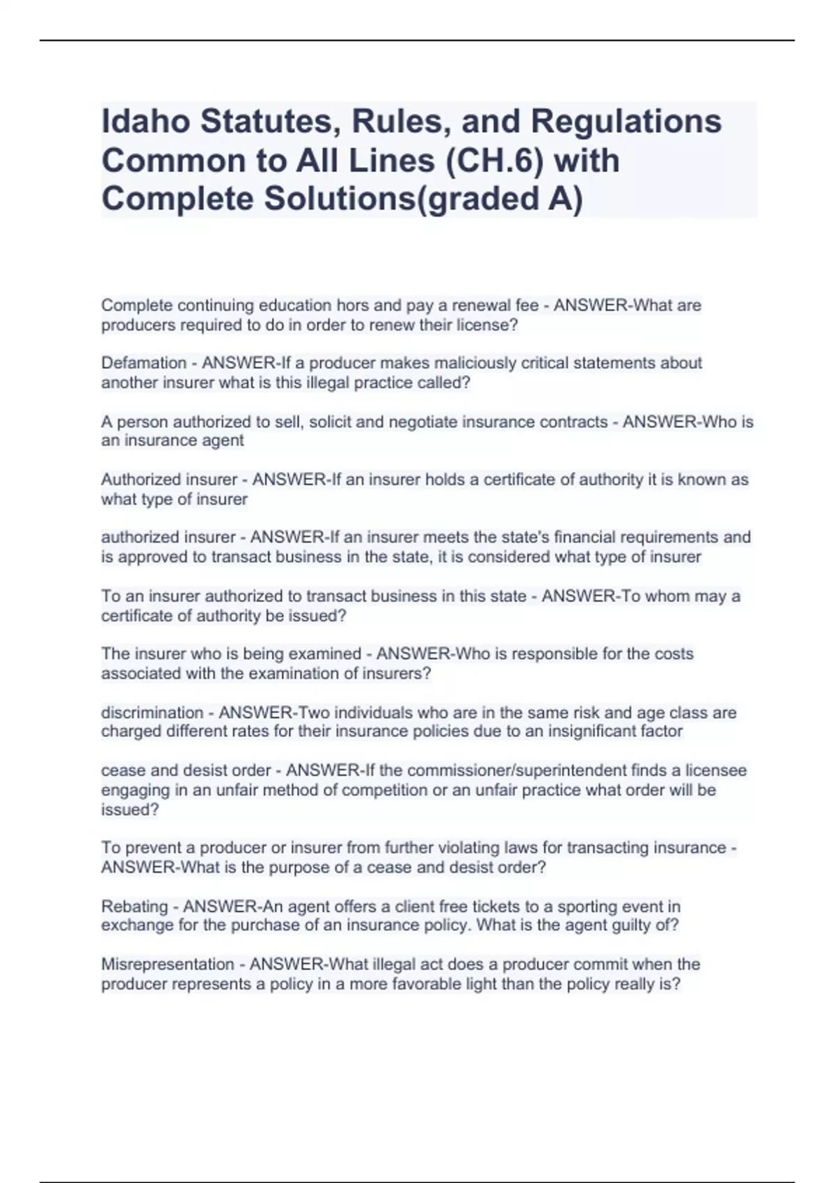 Idaho Life Insurance Exam bundle(complete package) Questions and Answers(RATED A+)Idaho Life Insurance Exam bundle(complete package) Questions and Answers(RATED A+)Idaho Life Insurance Exam bundle(complete package) Questions and Answers(RATED A+)Idaho Life Insurance Exam bundle(complete package) Questions and