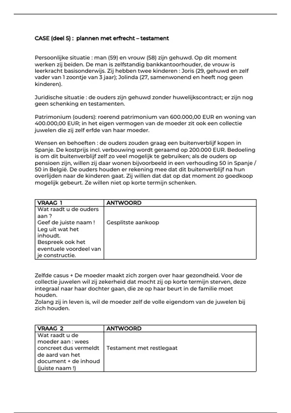 College-aantekeningen Case 2 - Erfrecht met partner - Vermogensplanning- examenuitslag: (leerkracht H. Dhont )