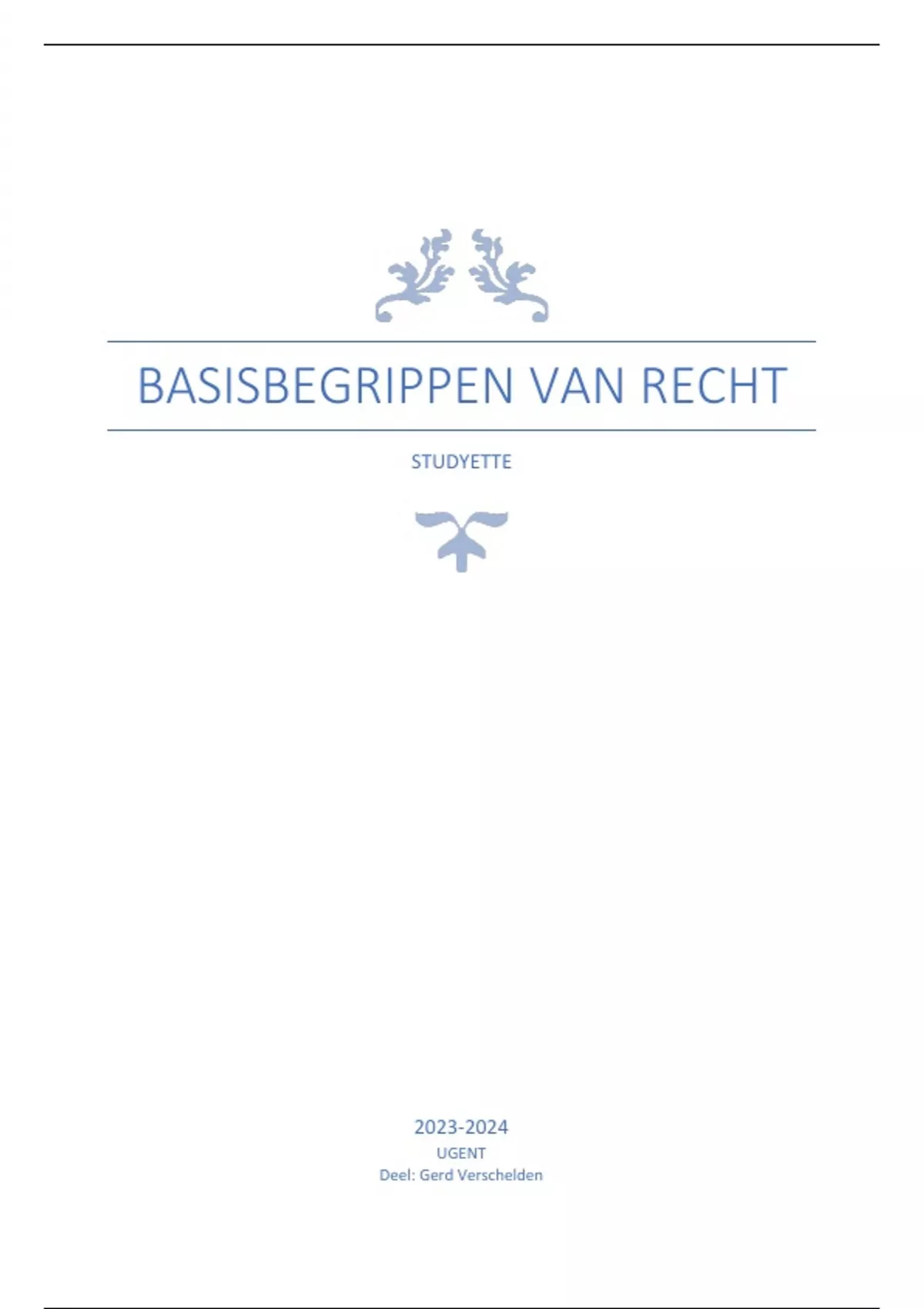Dit is een samenbundeling van mijn lesnota's uit de hoorcolleges Basisbegrippen van professors Verschelden en Taelman, aangevuld met het boek. de Documenten bevatten uitgebreide nota's en oefenvragen om jezelf tussendoor te testen en (incl. Franse woordjes verwerkt in het deel van professor Verschelden) om doelgericht en efficiënt te blokken.