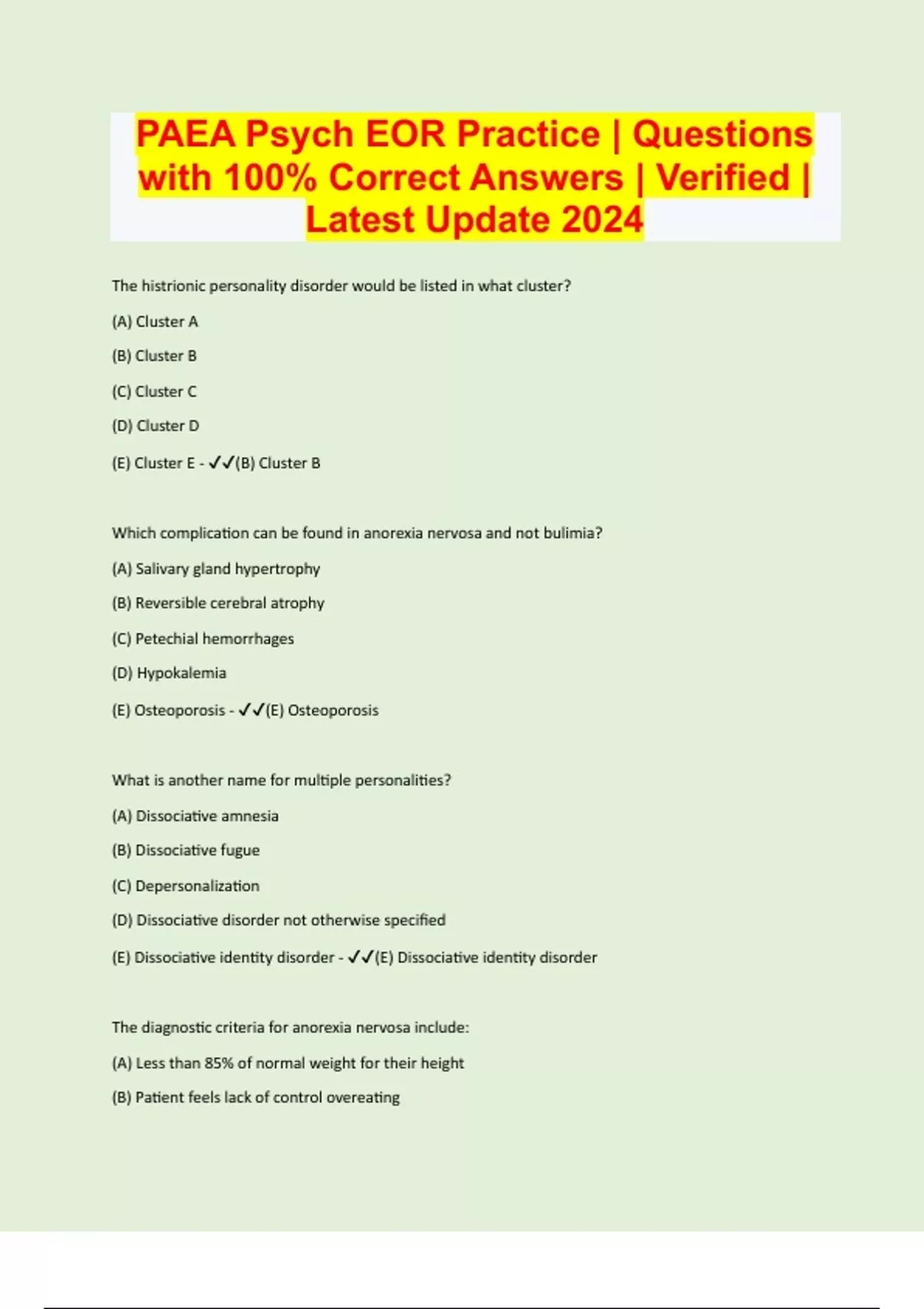 PAEA Psych EOR Practice | Questions with 100% Correct Answers | Verified | Latest Update 2024