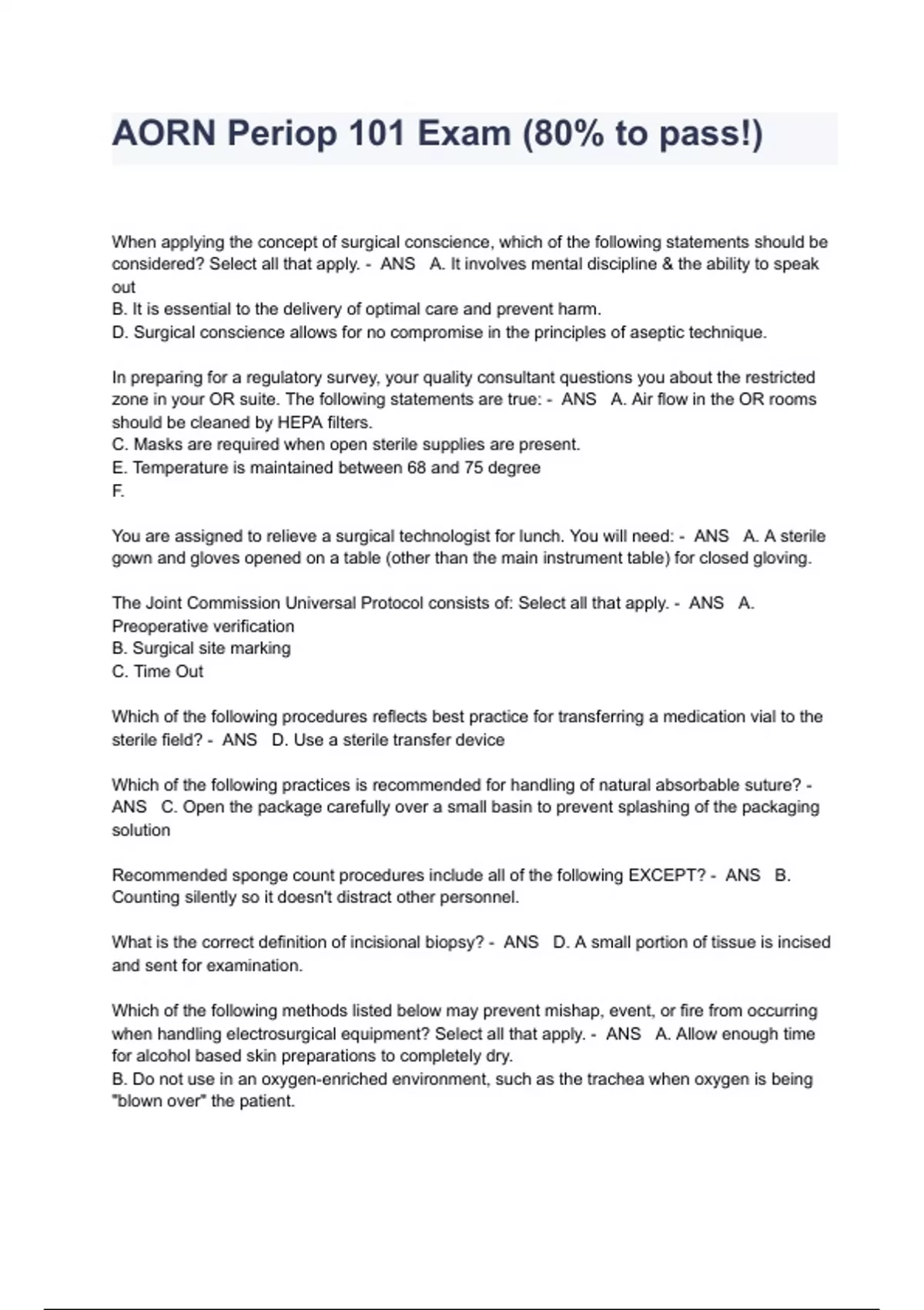 AORN Periop 101 Final Exam Questions With Answers Combined Package Solutions