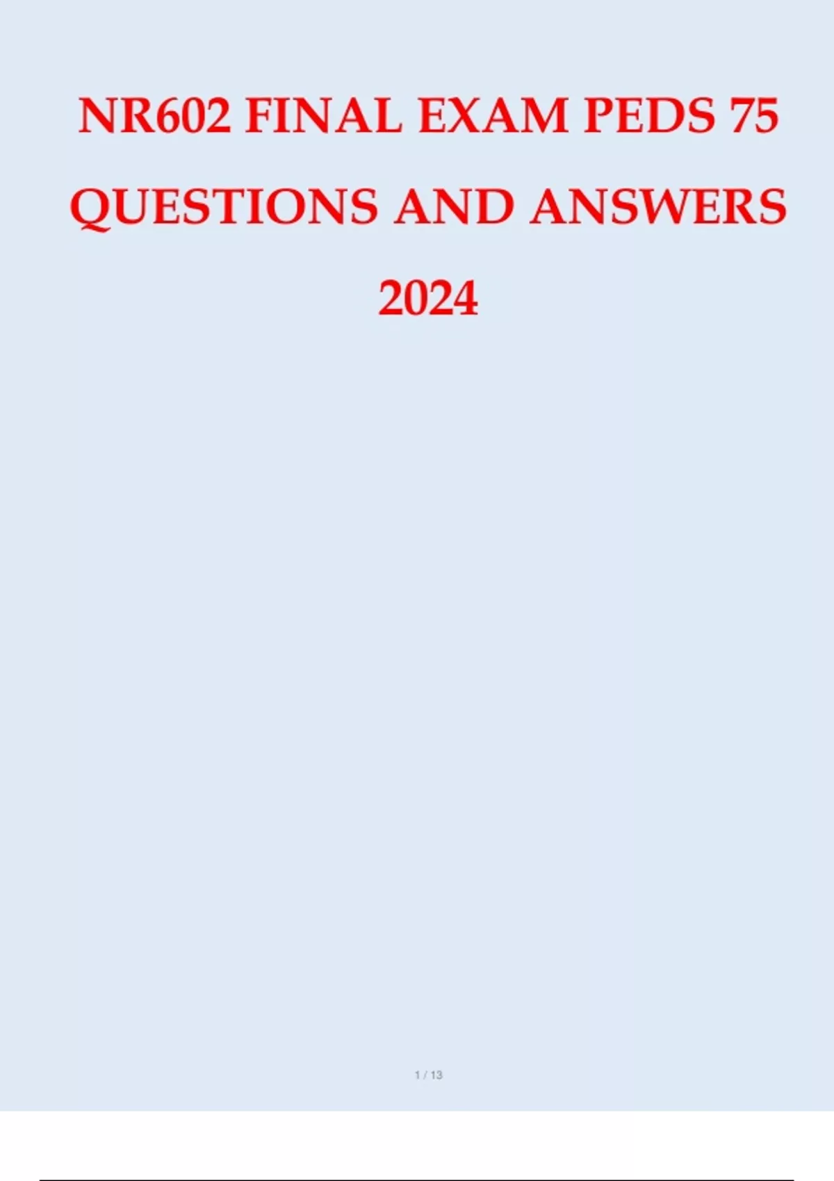 NR602 FINAL EXAM PEDS 75 QUESTIONS AND ANSWERS 2024 UPDATED AND VERIFIED CORRECTLY NR602 Midterm exam 108 questions and answers. 602 Final Exam