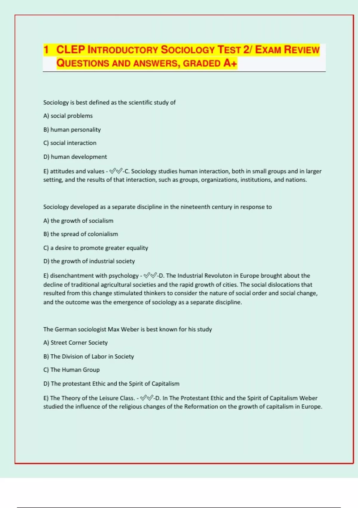 CLEP INTRODUCTORY SOCIOLOGY EXAM REVIEW QUESTIONS AND ANSWERS, GRADED A+| latest update 2024/25|