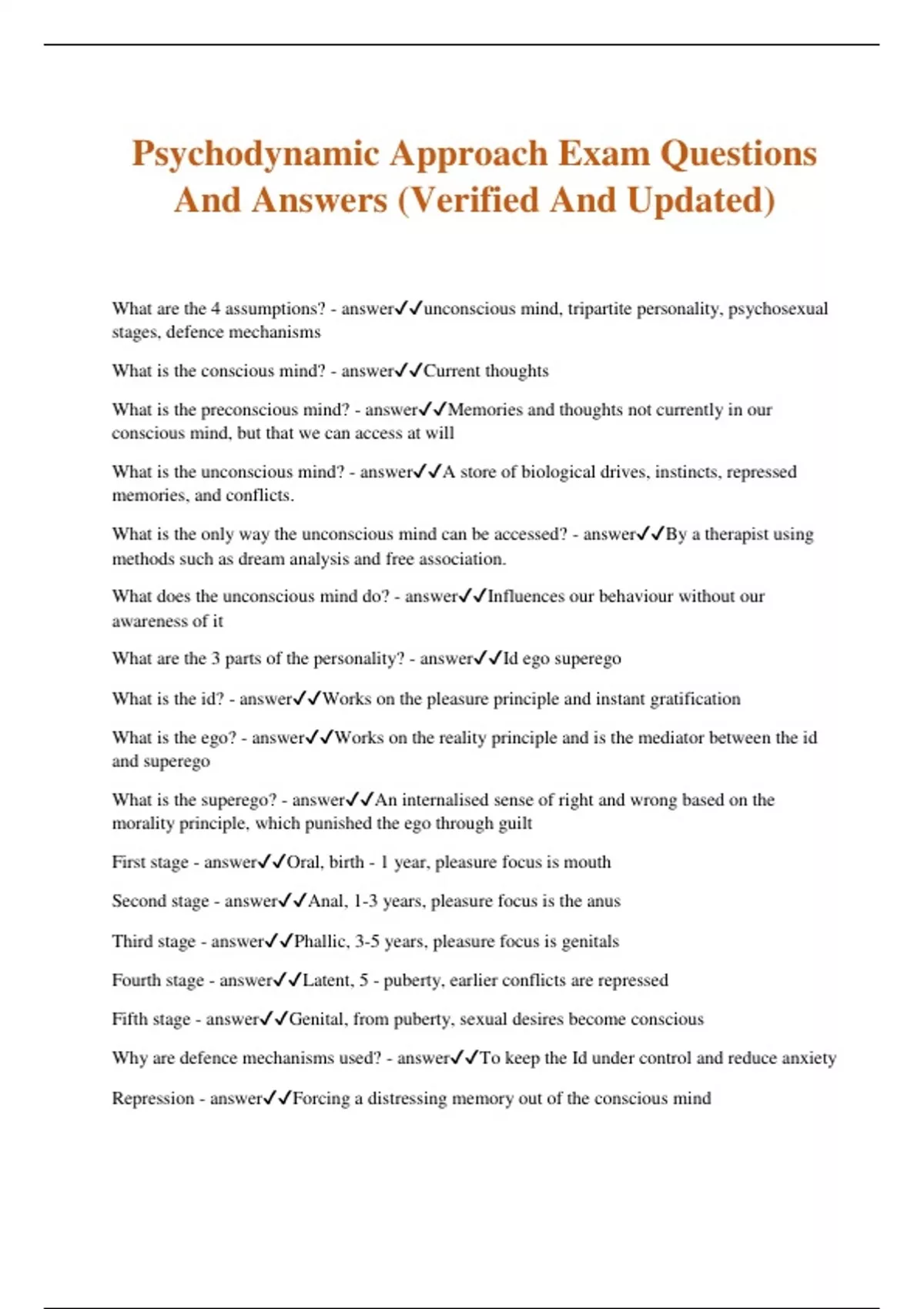 Psychodynamic Approach Exam Questions And Answers (Verified And Updated)