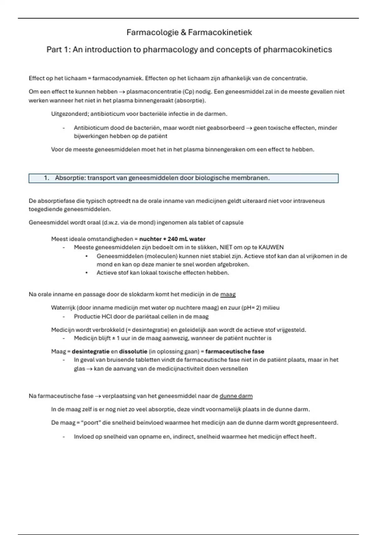 Samenvatting - Farmacologie & Farmacokinetiek - PART 01 tot en met PART 5
