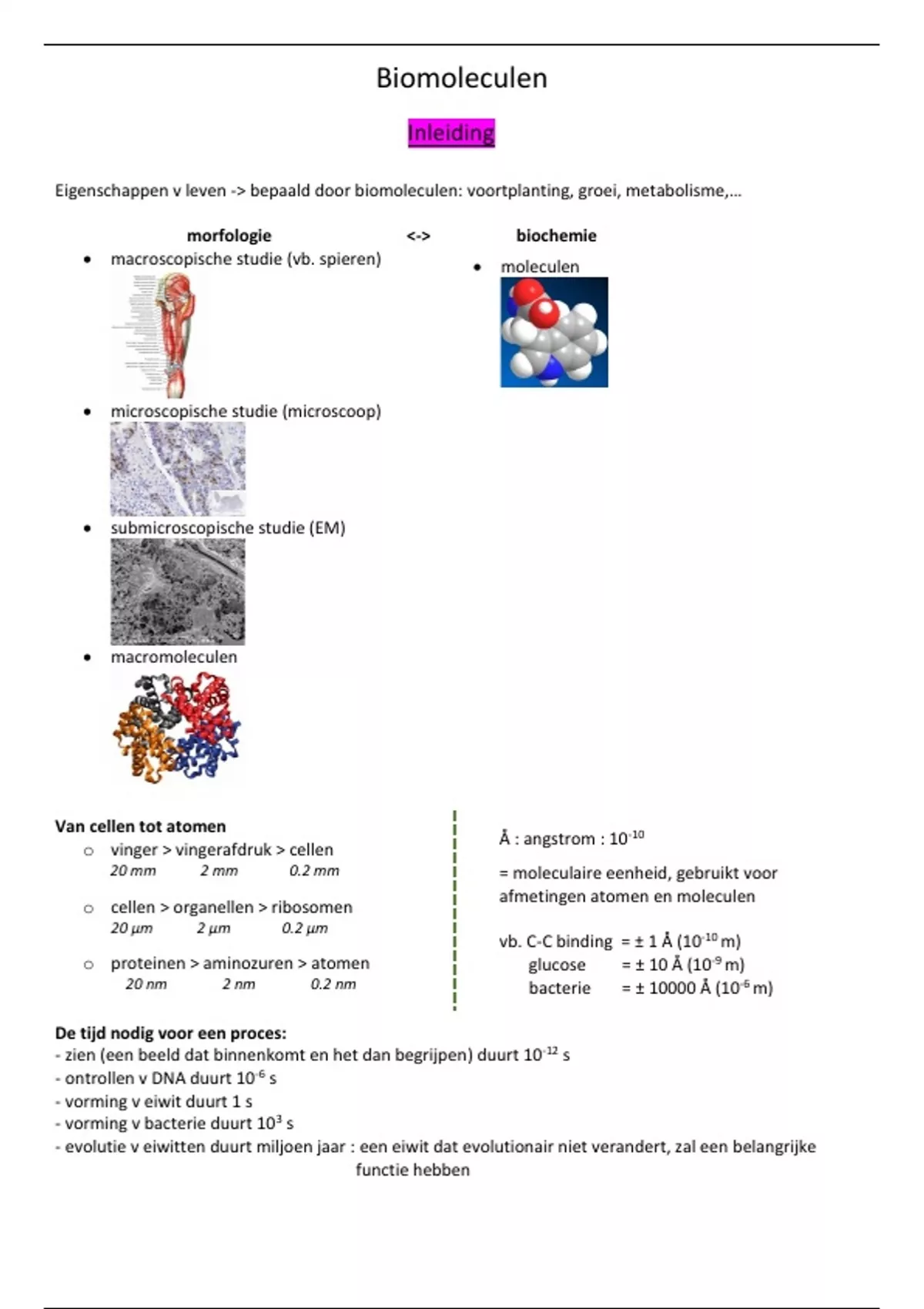 Deze voordeelbundel bestaat uit 2 documenten: een document met samenvatting van het deel biomoleculen en een document met college aantekeningen voor het deel cellen. Beide zijn volledig en gebasseerd op de cursus en op aantekeningen van de les.