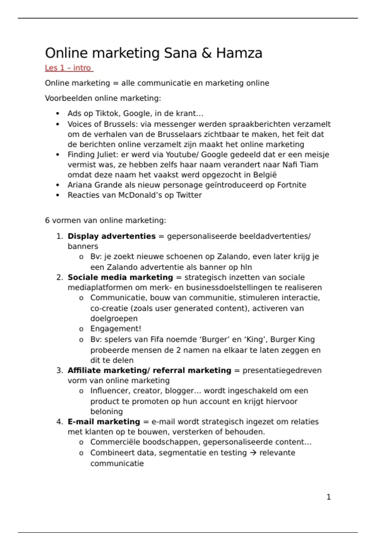 Dit is een volledige samenvatting van het vak online marketing, gegeven door Sana, Hamza en (het deel community building) Camille. De samenvatting is gebaseerd op hun PowerPoints en extra tips of voorbeelden in lessen. Succes!