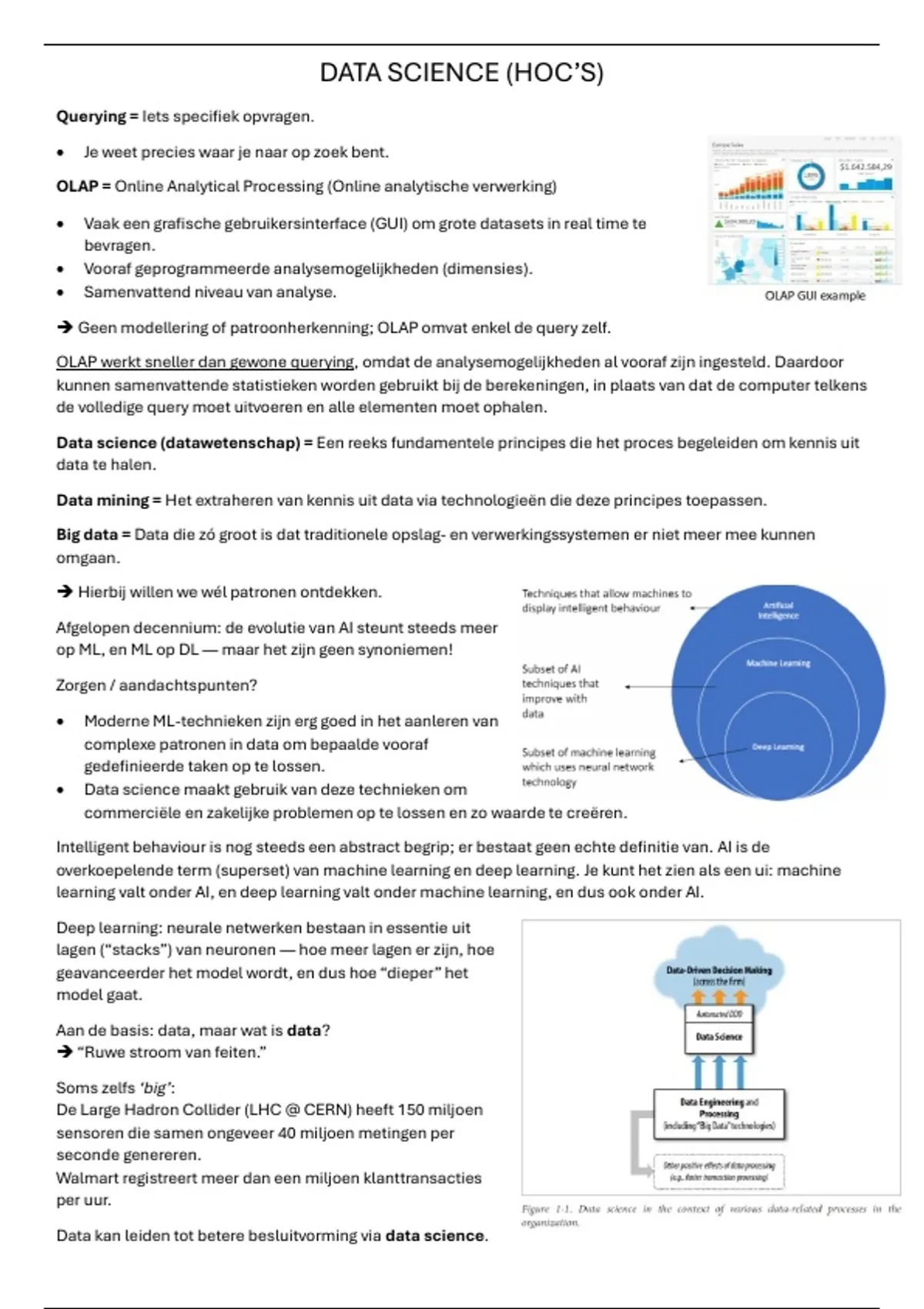 Volledige Nederlandstalige samenvatting van het vak Data Science (Handelsingenieur 3e bachelor). In de kleine letters (2 lettergroottes kleiner) vind je aanvullende informatie die ik erbij heb genoteerd. Dit waren letterlijke woorden van de prof tijdens de hoorcollege!!! De meeste vragen tijdens het hoorcollege zijn ook opgelost in het document.