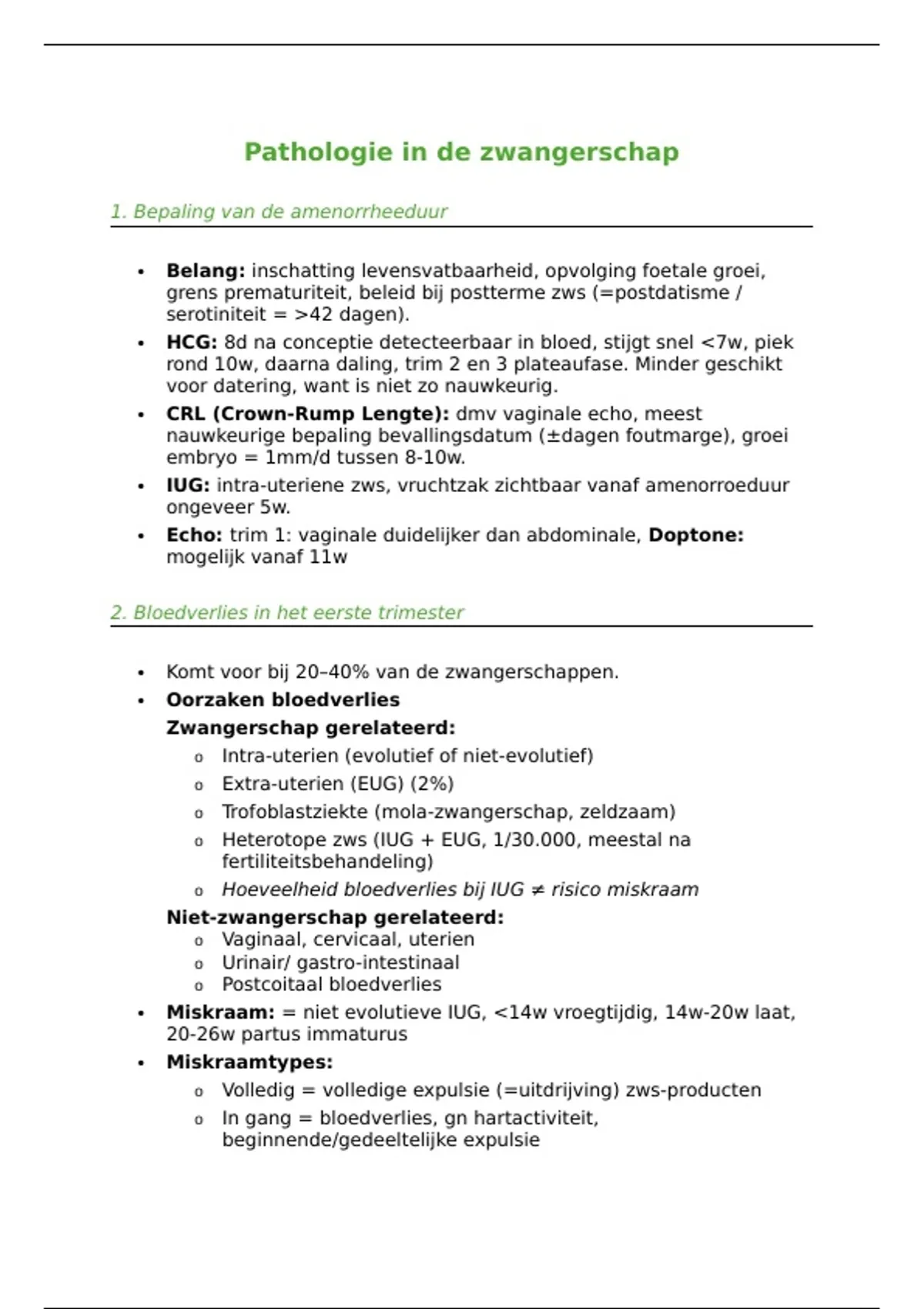 Dit is een samenvatting over 'de pathologie in de zwangerschap'. Dit is een onderdeel van het vak 'pathologie in de zwangerschap, arbeid en kraambed' en wordt gegeven in het 2e jaar van de opleiding vroedkunde.