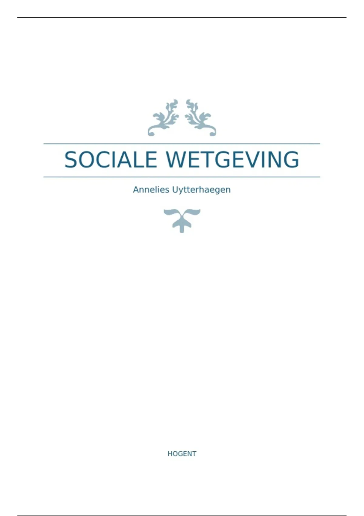 Overzichtelijke en examengerichte samenvatting van Sociale Wetgeving (HoGent). Je krijgt een helder schema van het arbeidsrecht en socialezekerheidsrecht, de bronnen van sociale wetgeving, en alles rond collectieve arbeidsovereenkomsten (CAO’s) (NAR, paritaire comités, ondernemingsniveau). Daarnaast behandelt dit document de Arbeidsovereenkomstenwet van 3 juli 1978: soorten arbeidsovereenkomsten, rechten en plichten van werkgever/werknemer, schorsingen (ziekte, vakantie, moederschapsrust, tijdskrediet) en het einde van de arbeidsovereenkomst (opzeg, ontslag, vergoedingen).