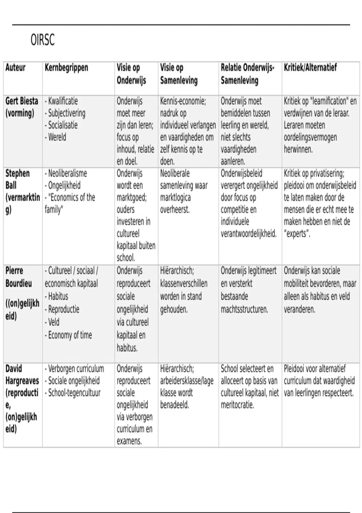 Auteur Kernbegrippen Visie op Visie op Relatie Onderwijs- Kritiek/Alternatief