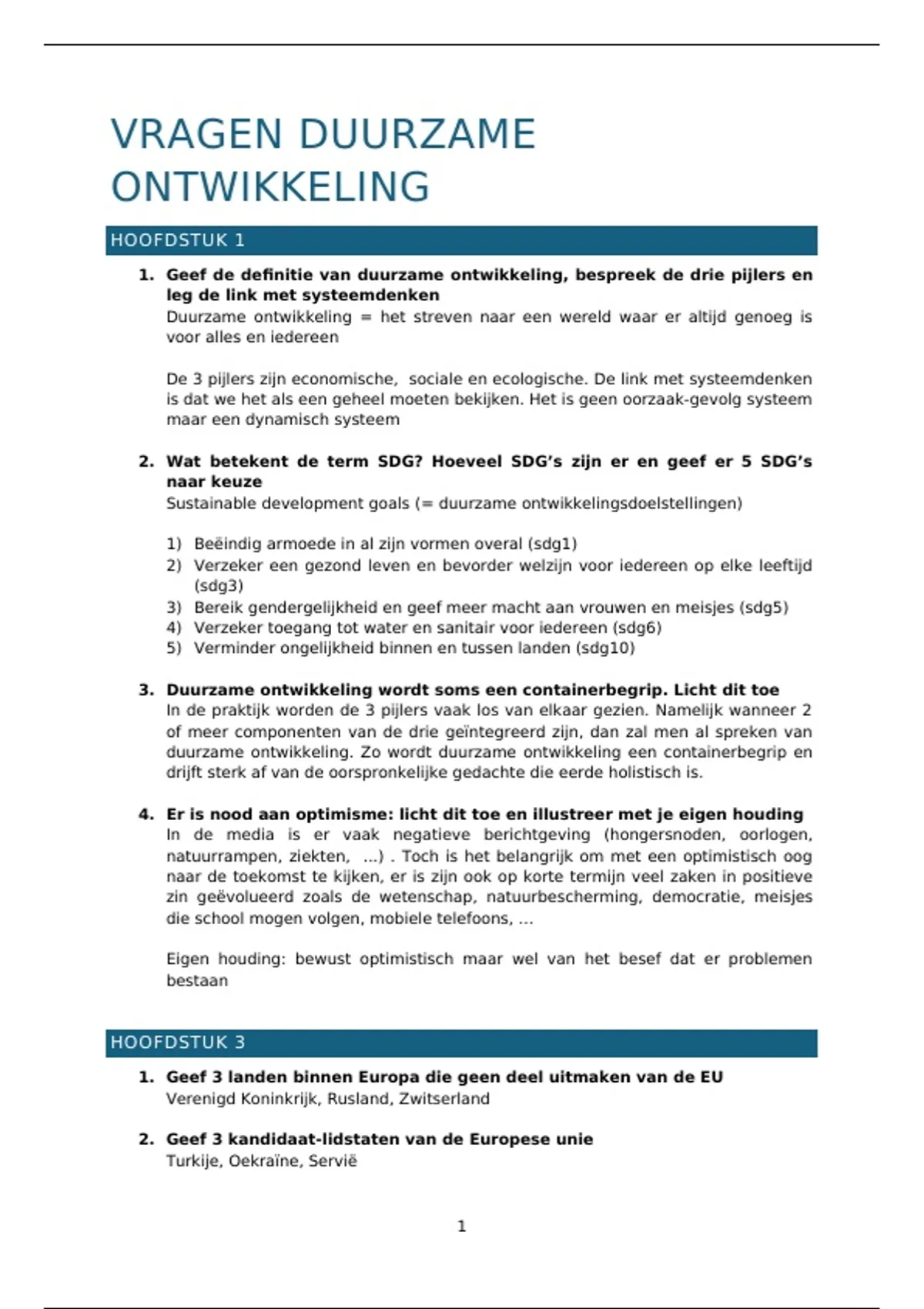1. Geef de definitie van duurzame ontwikkeling, bespreek de drie pijlers en