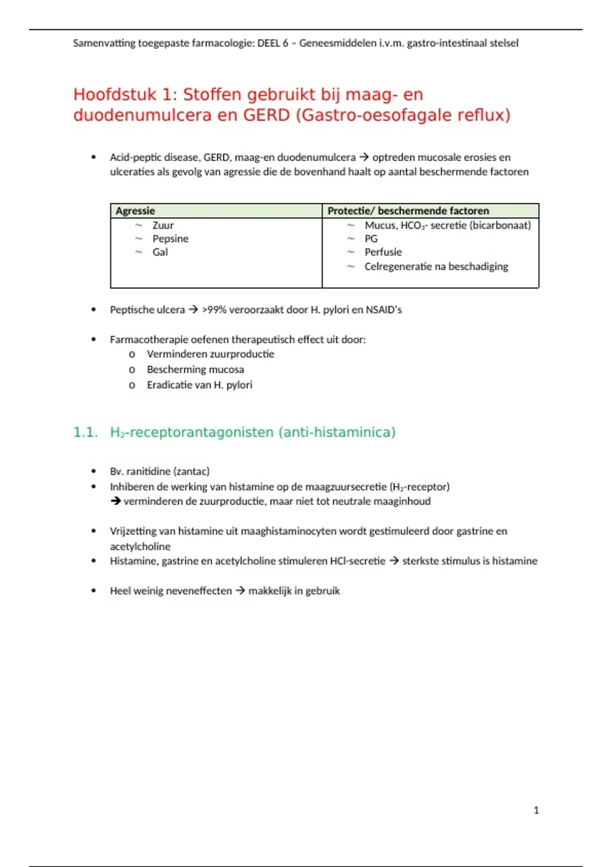 , Samenvatting toegepaste farmacologie: DEEL 6 – Geneesmiddelen i.v.m. gastro-intestinaal stelsel